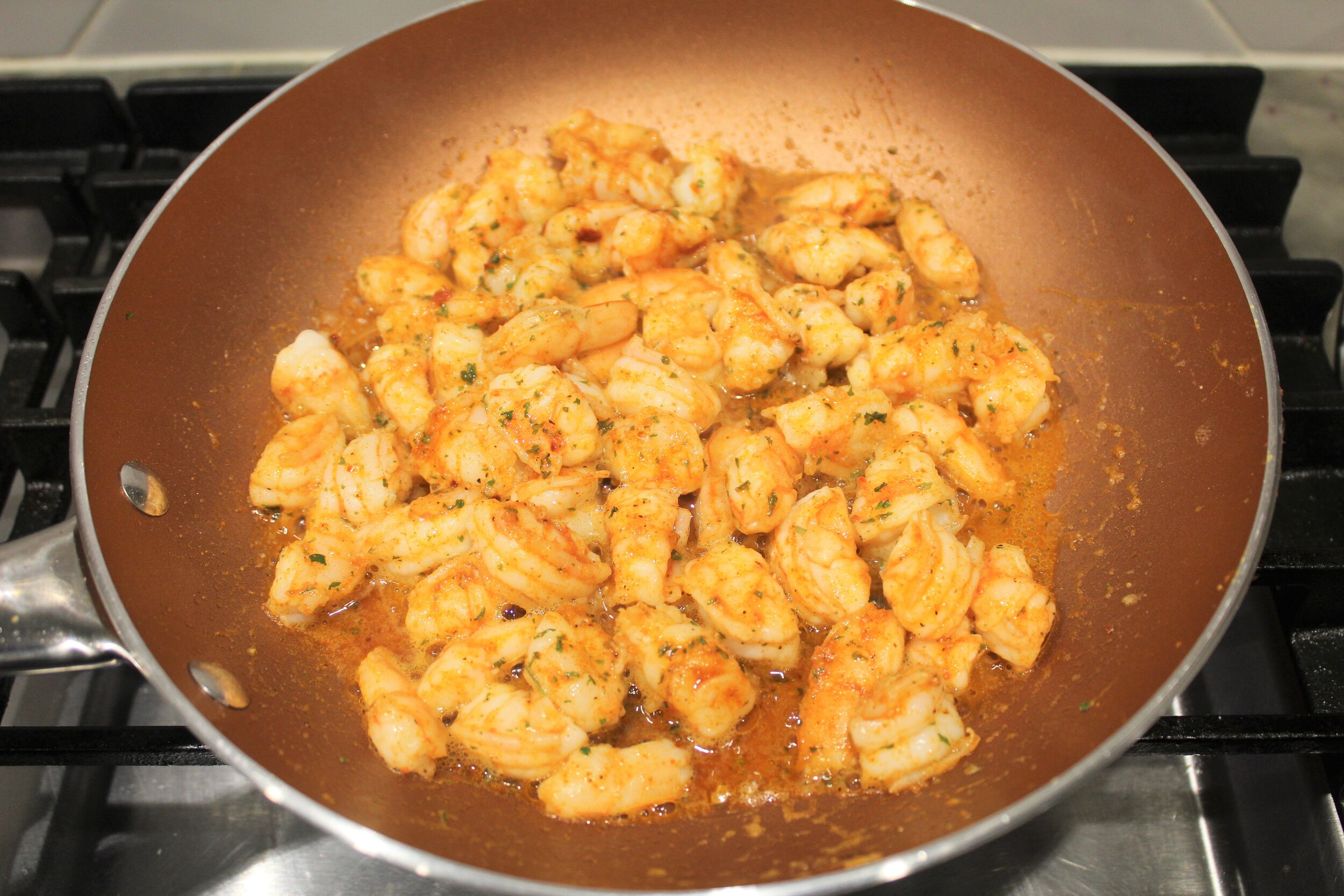 Once the veggies have cooked, remove them from the pan and put them on a separate plate. Add more butter to the pan, seasonings and add the shrimp. Cook the shrimp until they are opaque, slight pink.