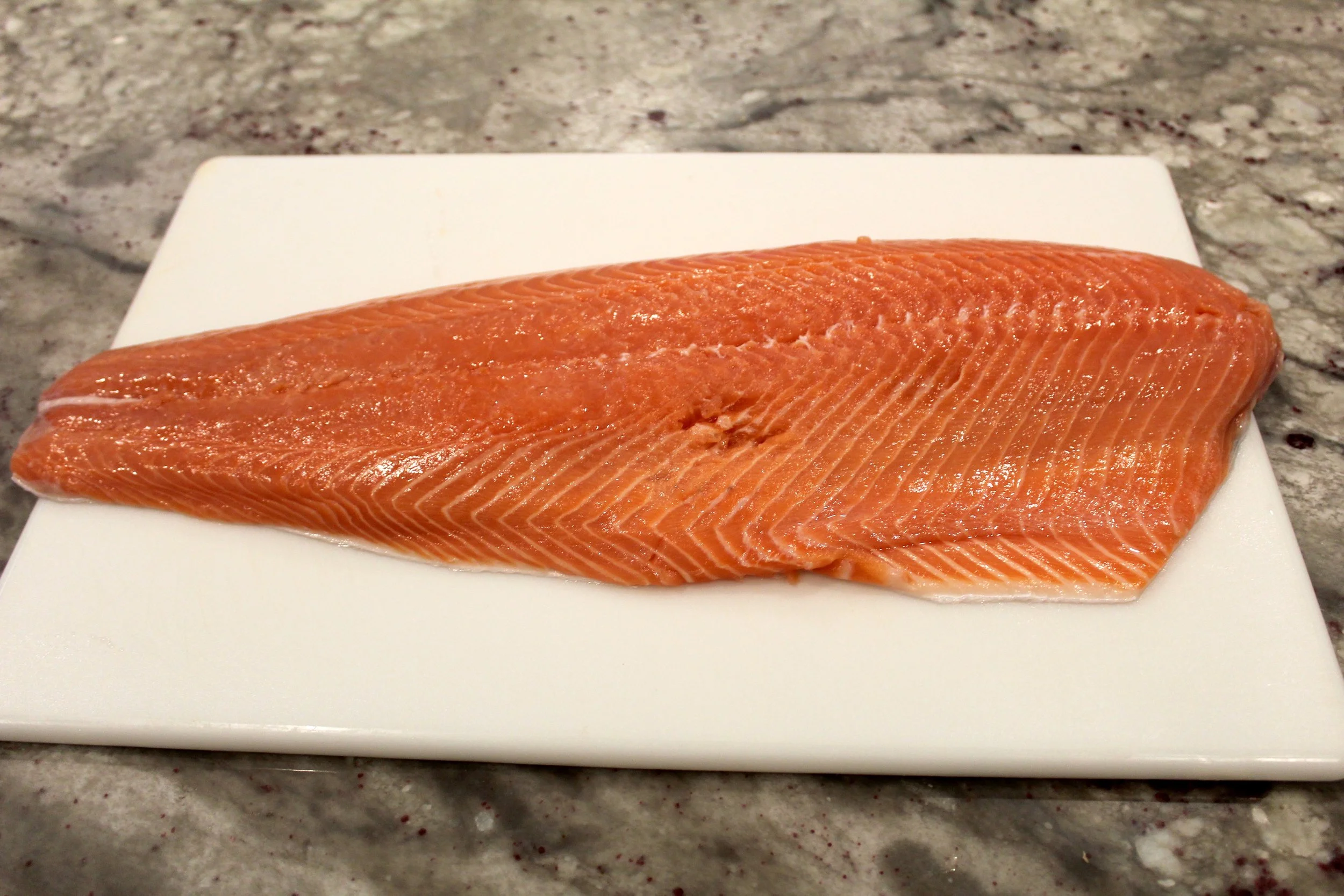 - Remove the skin from the salmon and cut it into 2 inch sized pieces.