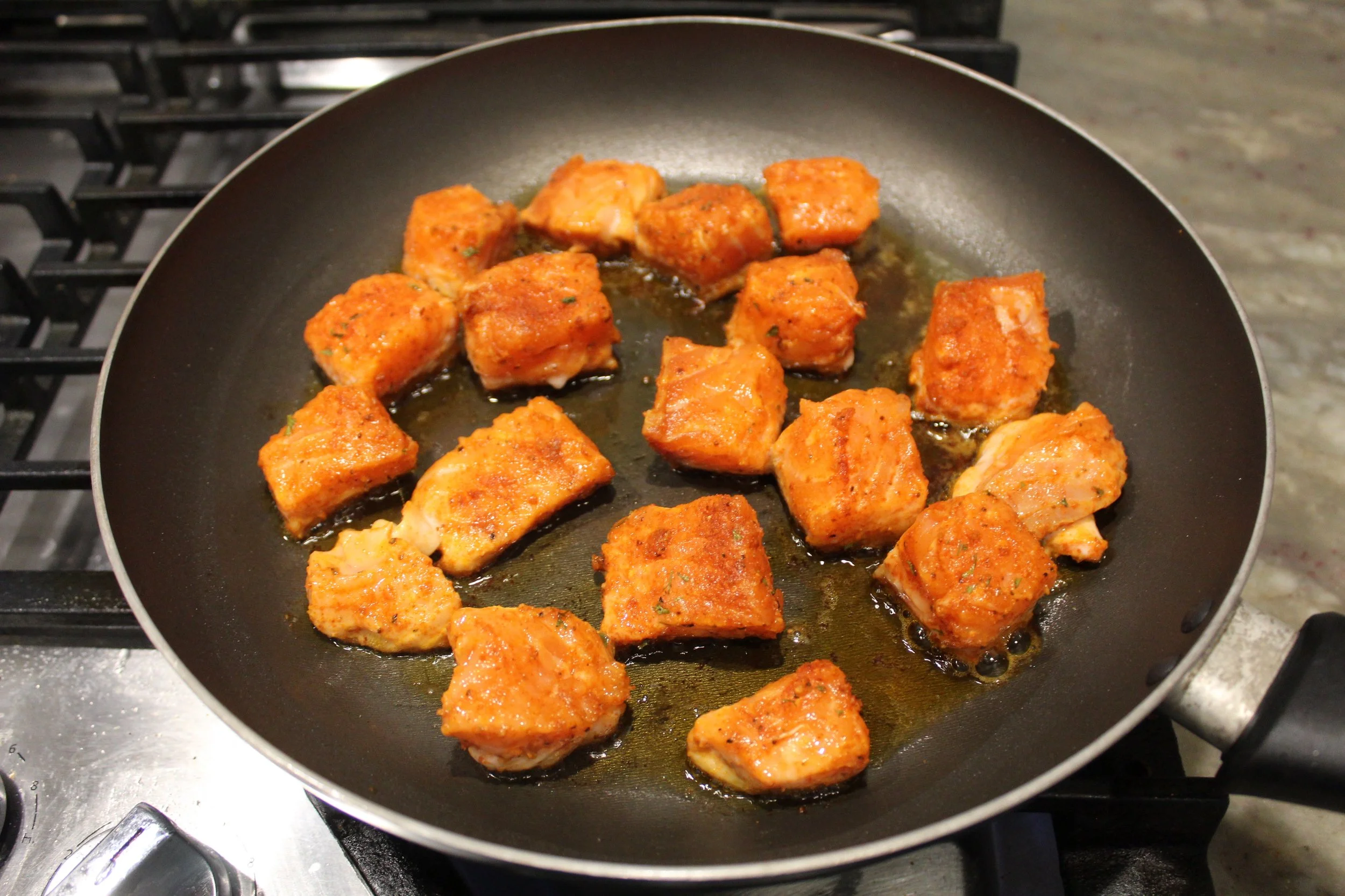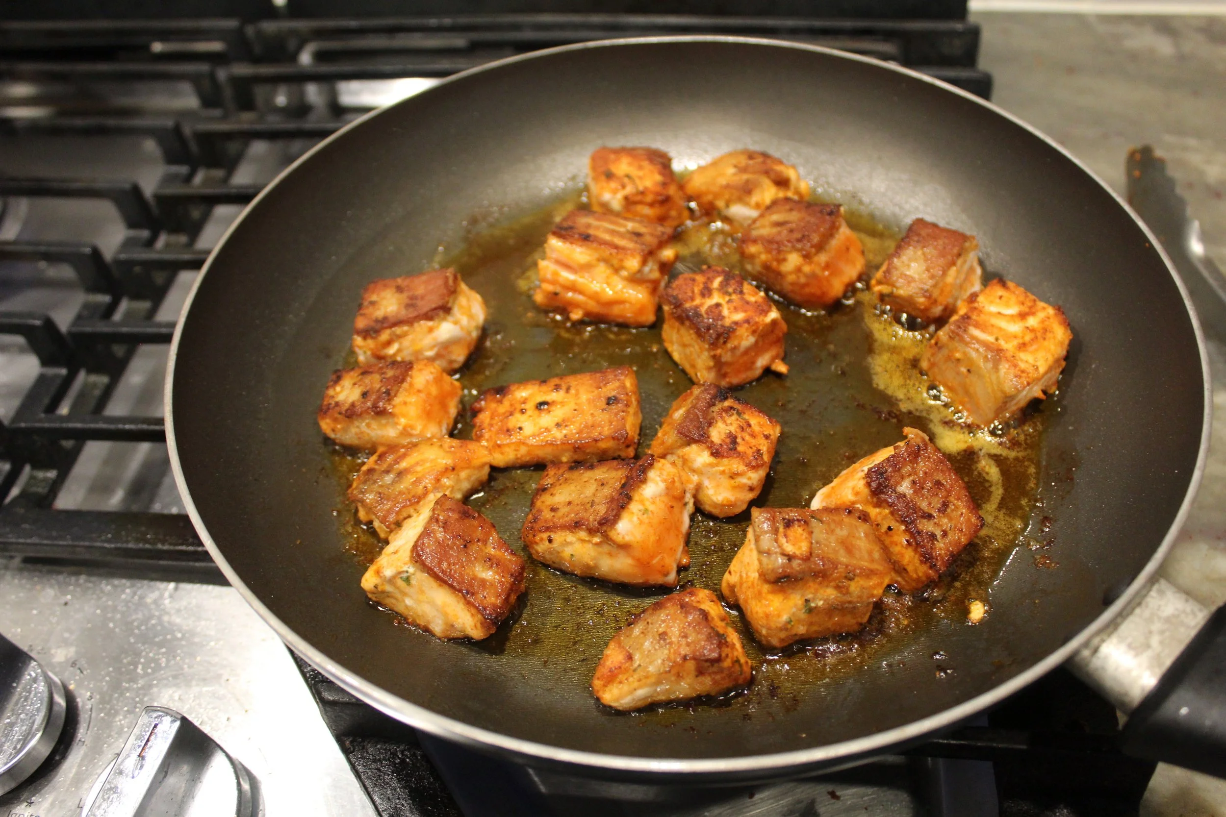 Cook the salmon bites 2-3 minutes on each side or until they are fully cooked. Once cooked, remove from the skillet and set aside.