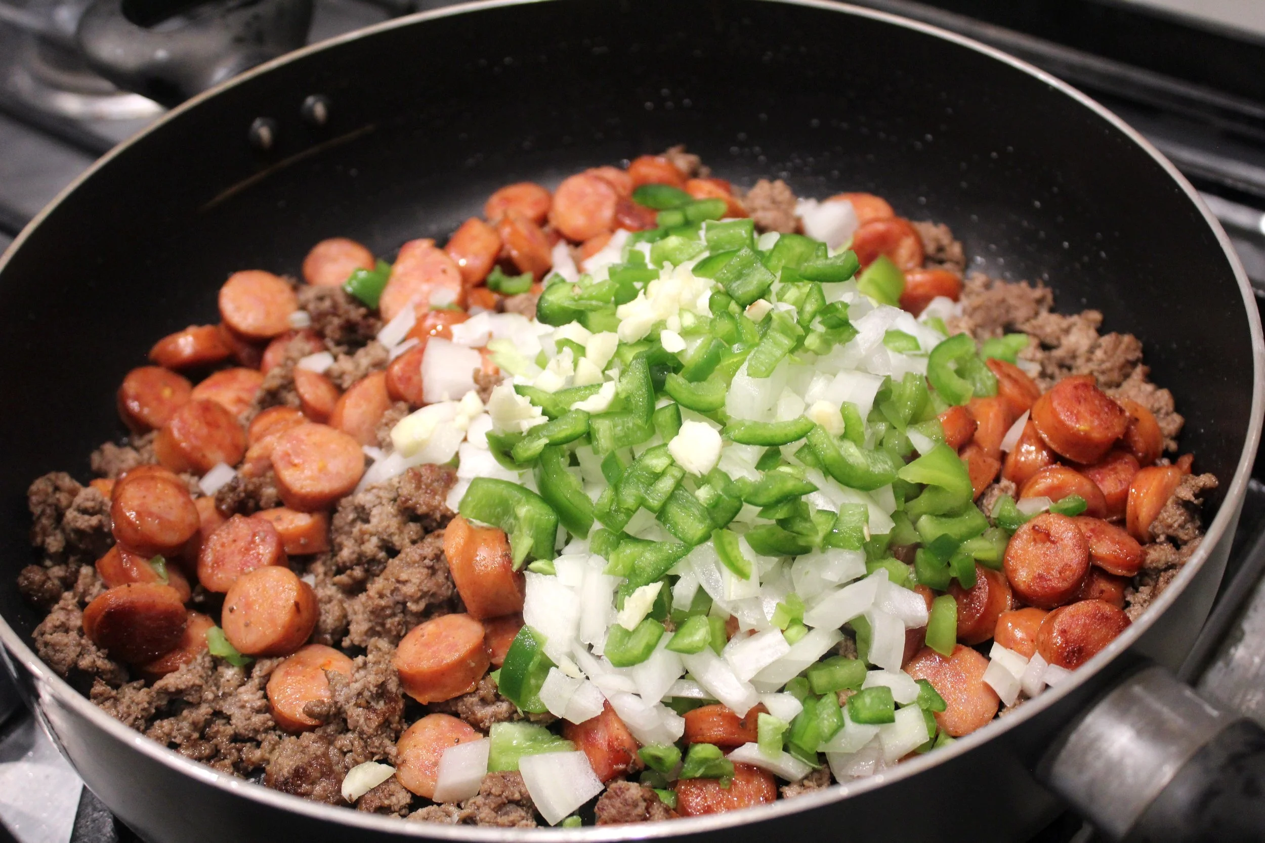 To the ground beef, add the cooked sausage, 1/2 diced white onion, 1 diced green bell pepper, 2 chopped cloves of garlic and 1 diced jalapeno and stir well. Leave a few of the seeds in the jalapeno for some added spice.