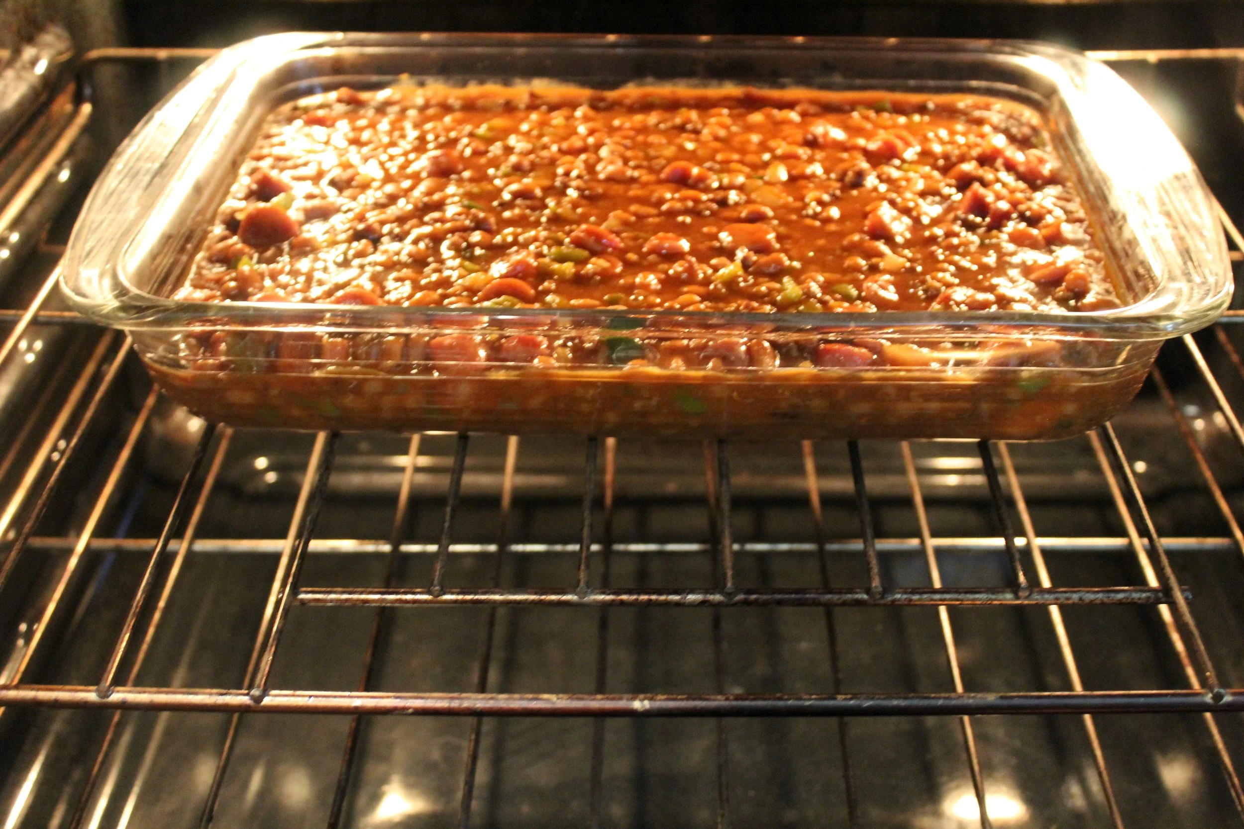 Pour the beans in an oven-safe baking dish and add to a 350 degree oven for 25 minutes.