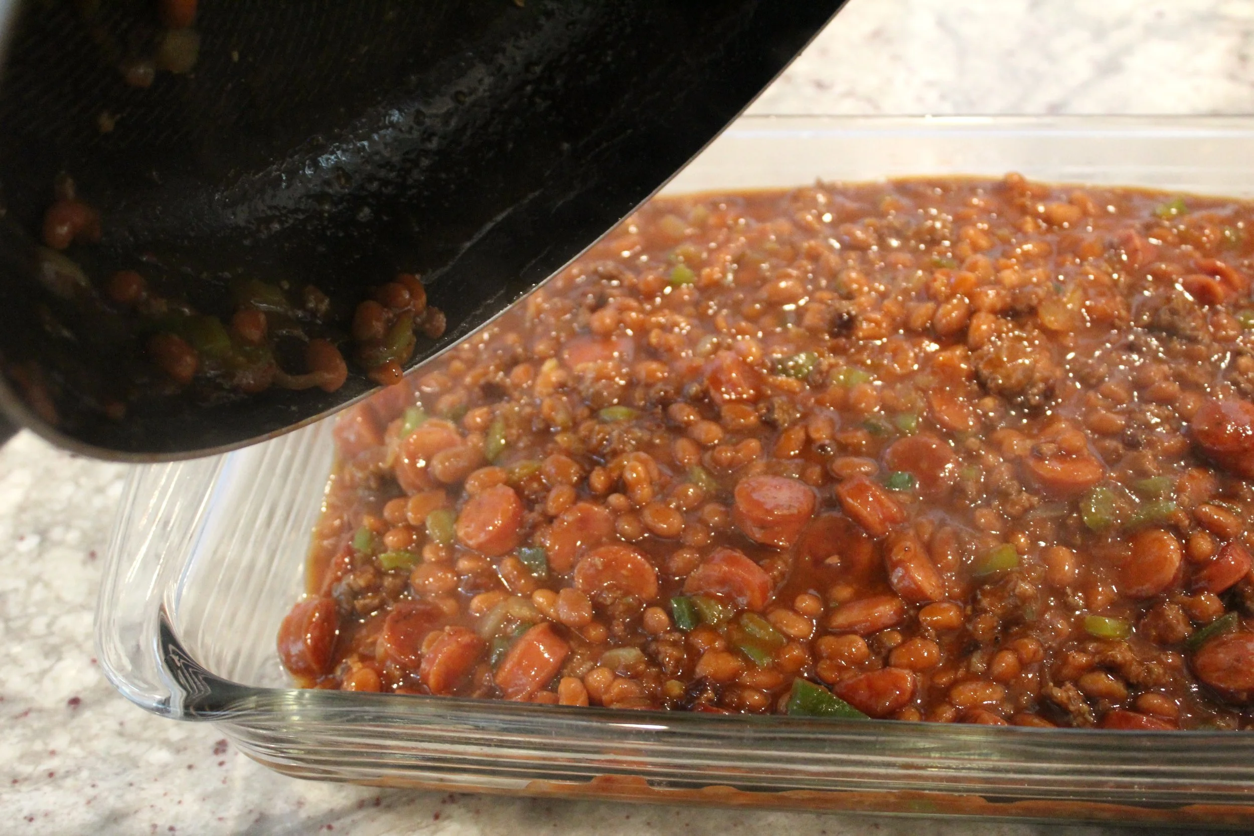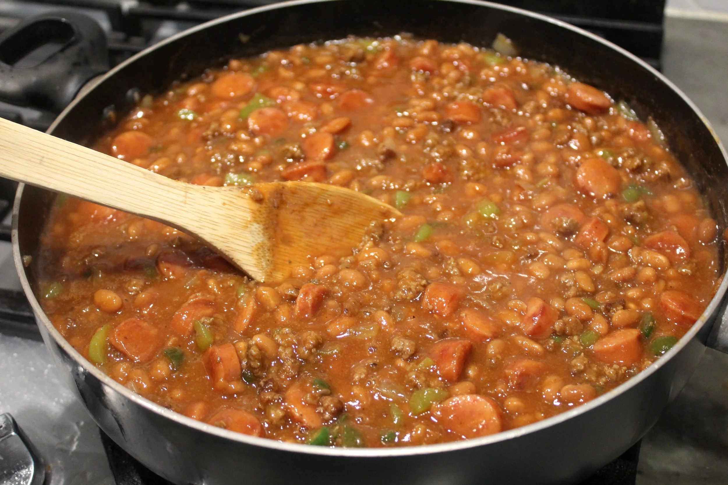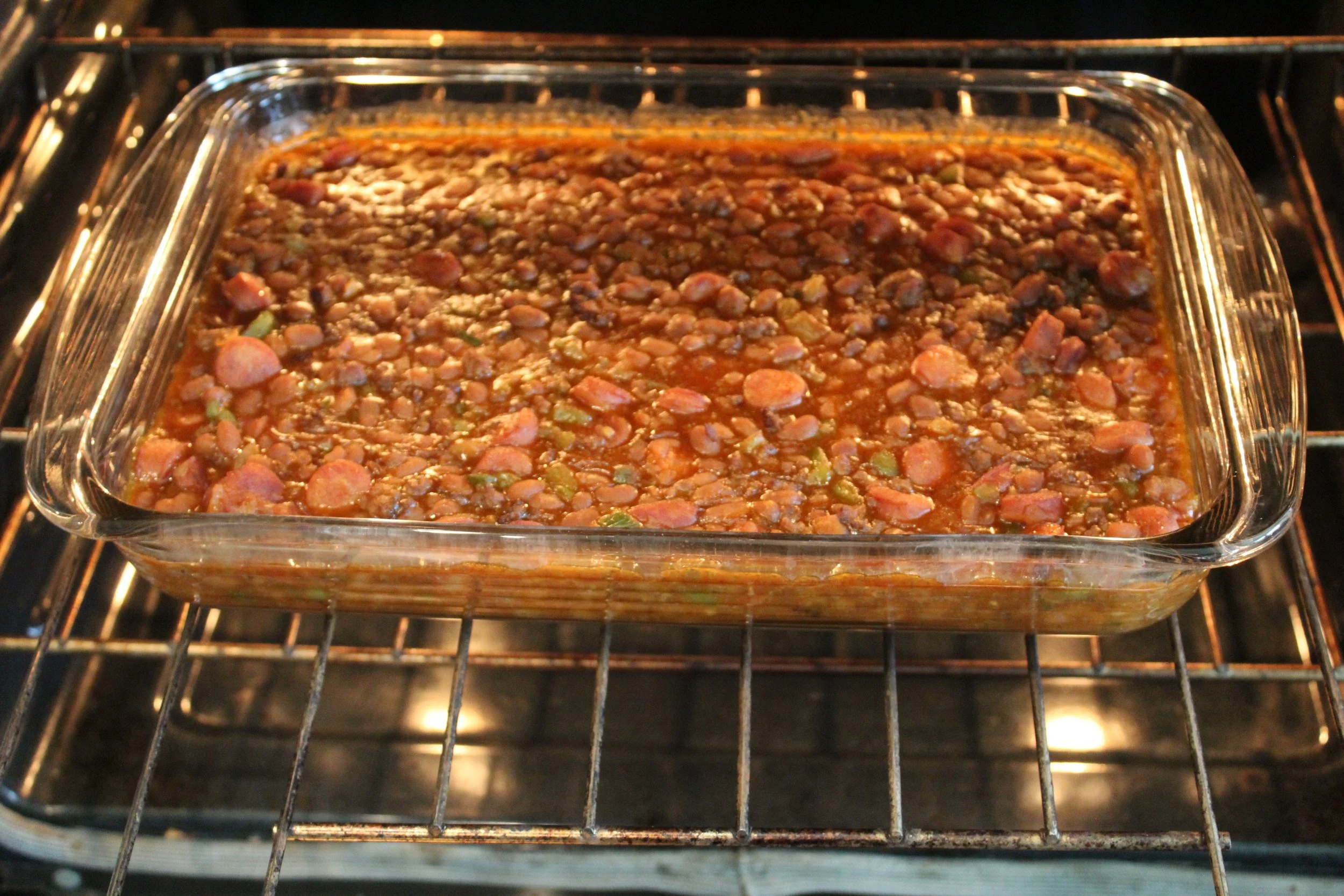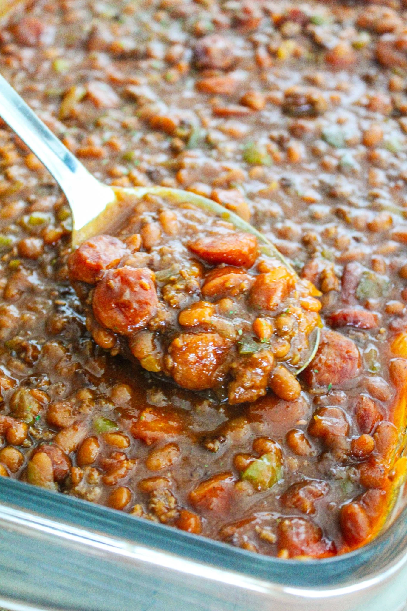 Southern baked beans with ground beef, smoked sausage and veggies simmered and baked in a sweet sauce.