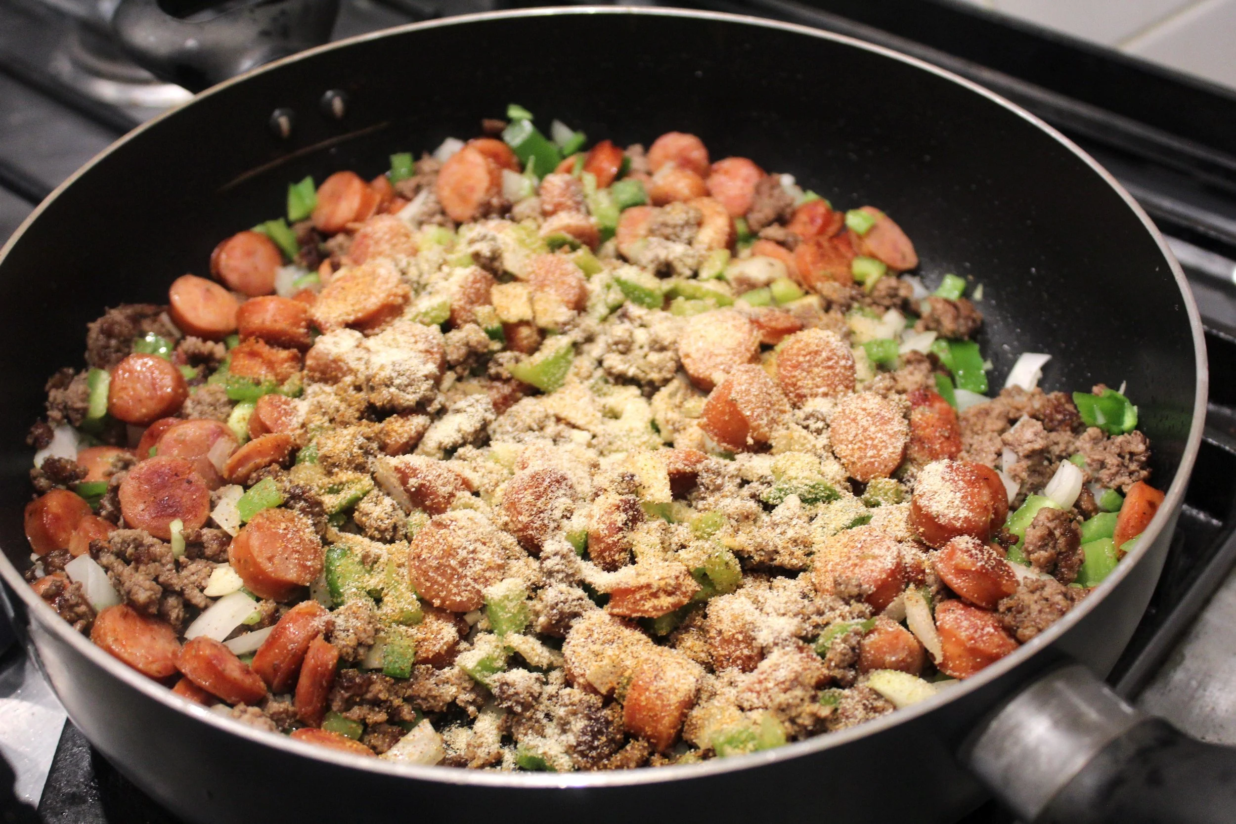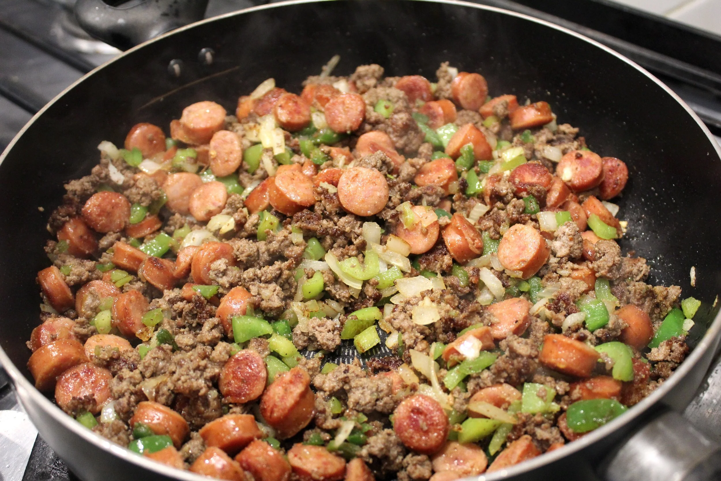 - Add the browned sausages to the ground beef along with onion, bell pepper, jalapeno and garlic and stir well.