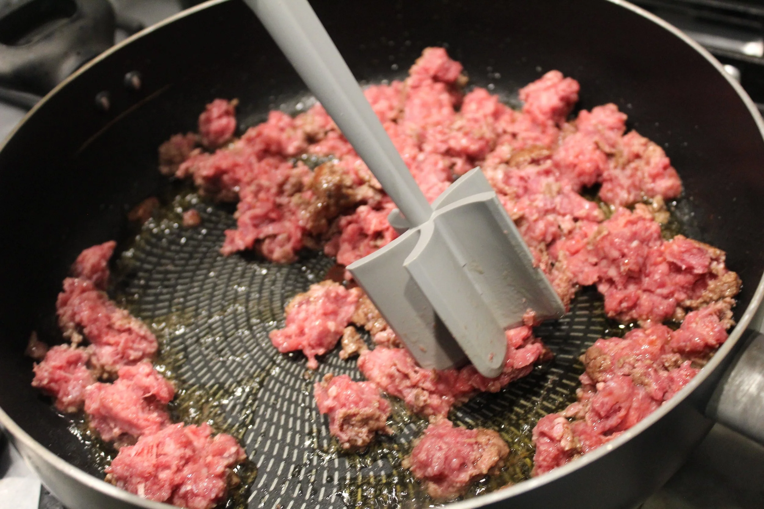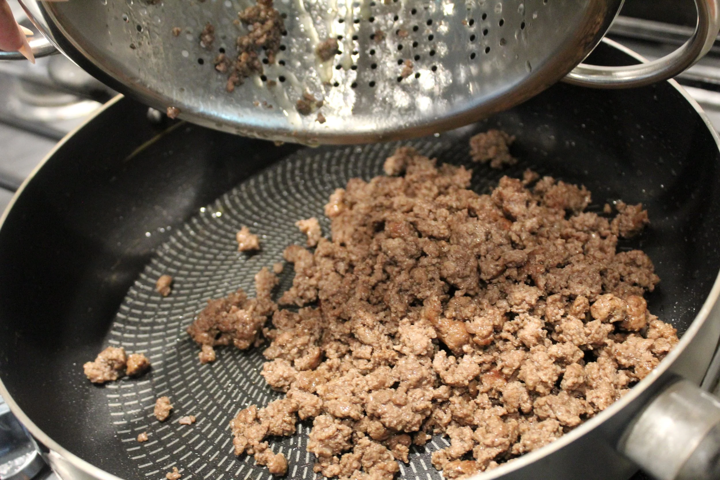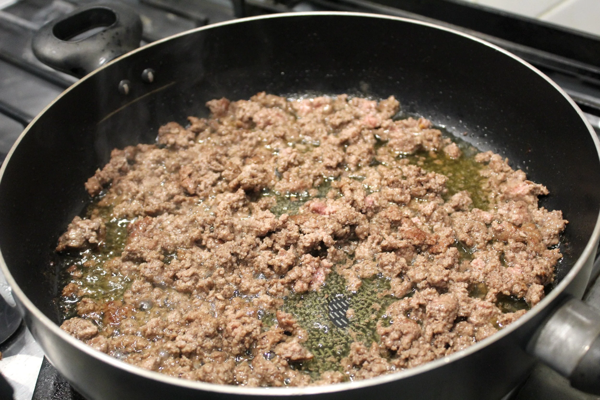 - In the same pan, add the ground beef and fully cook. Once cooked, remove any excess oil and add the ground beef back to the pan.