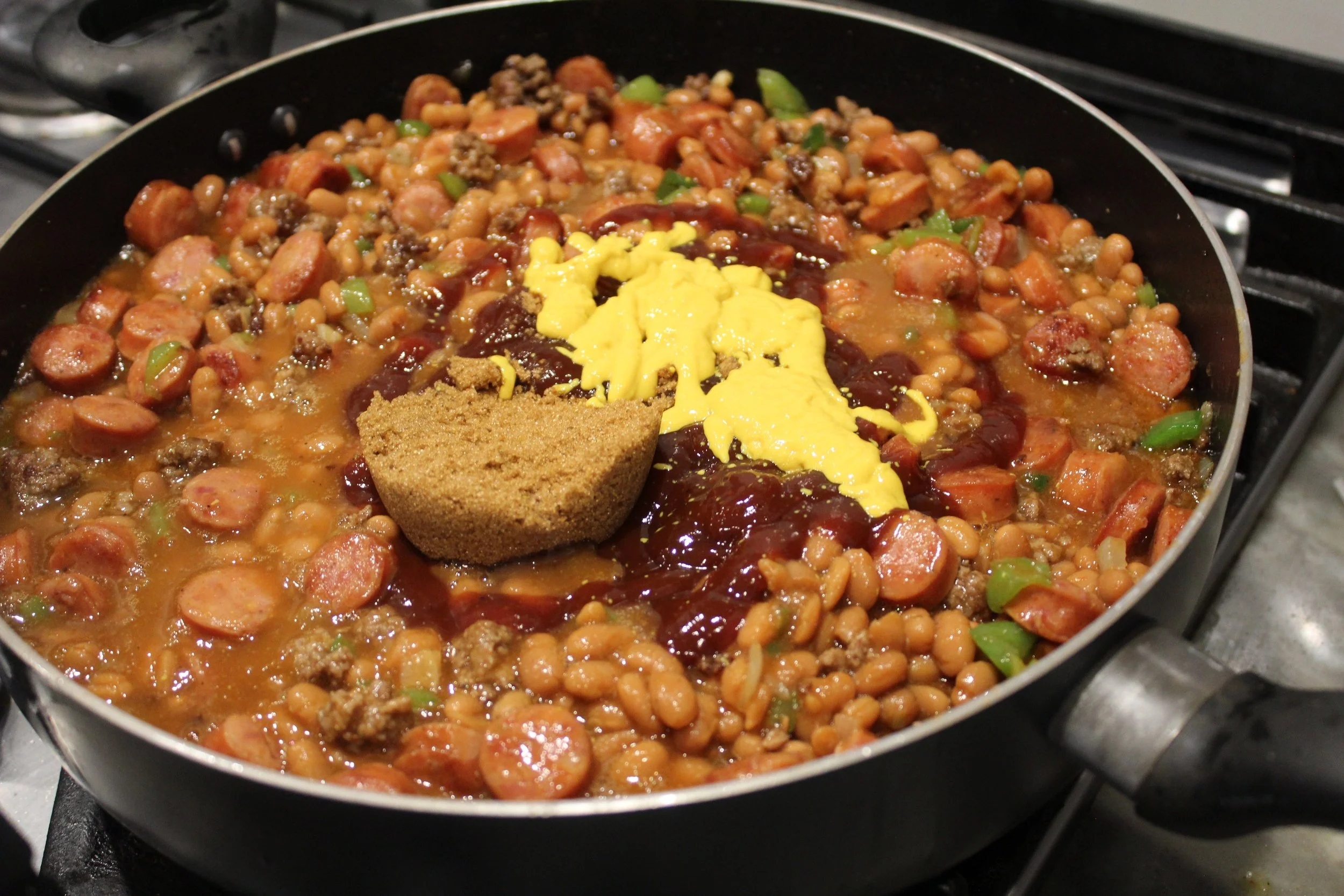 - Add the can of baked beans and stir well. Add the bbq sauce, mustard and brown sugar and stir well.