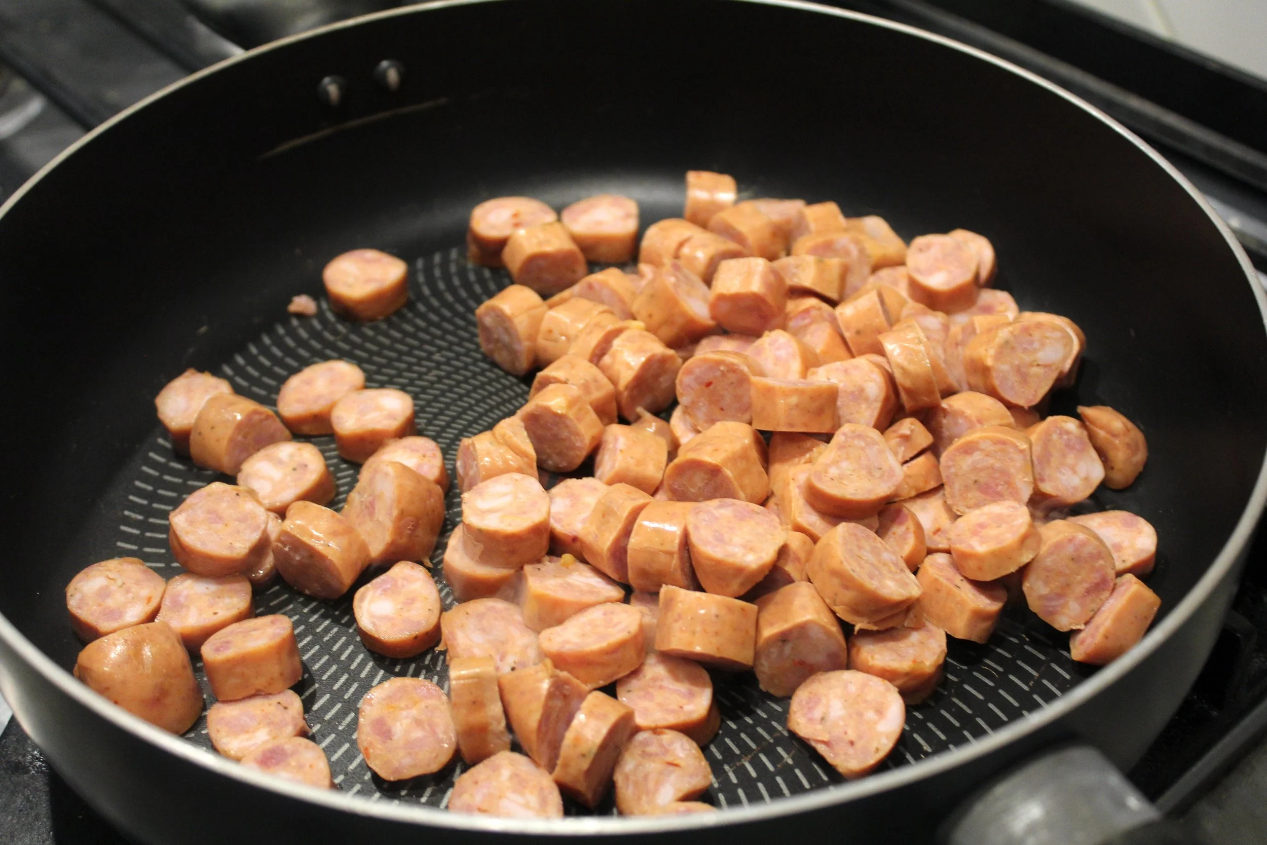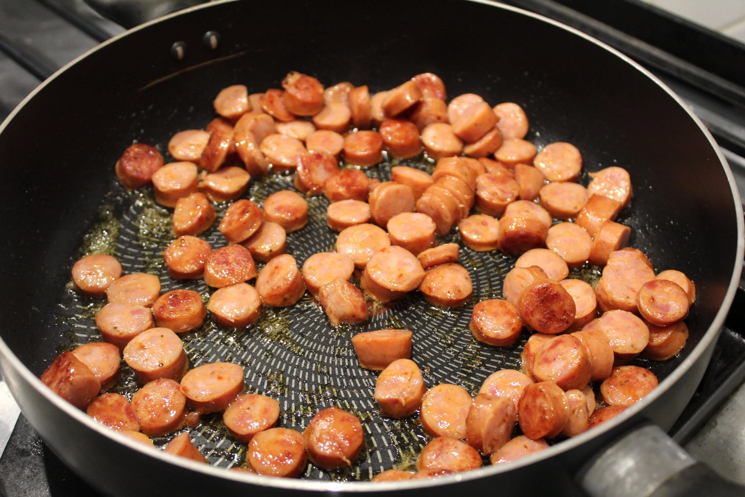 - Cut the smoked sausage into small pieces. Add them to a hot pan and cook until the sausages are browned and set aside.