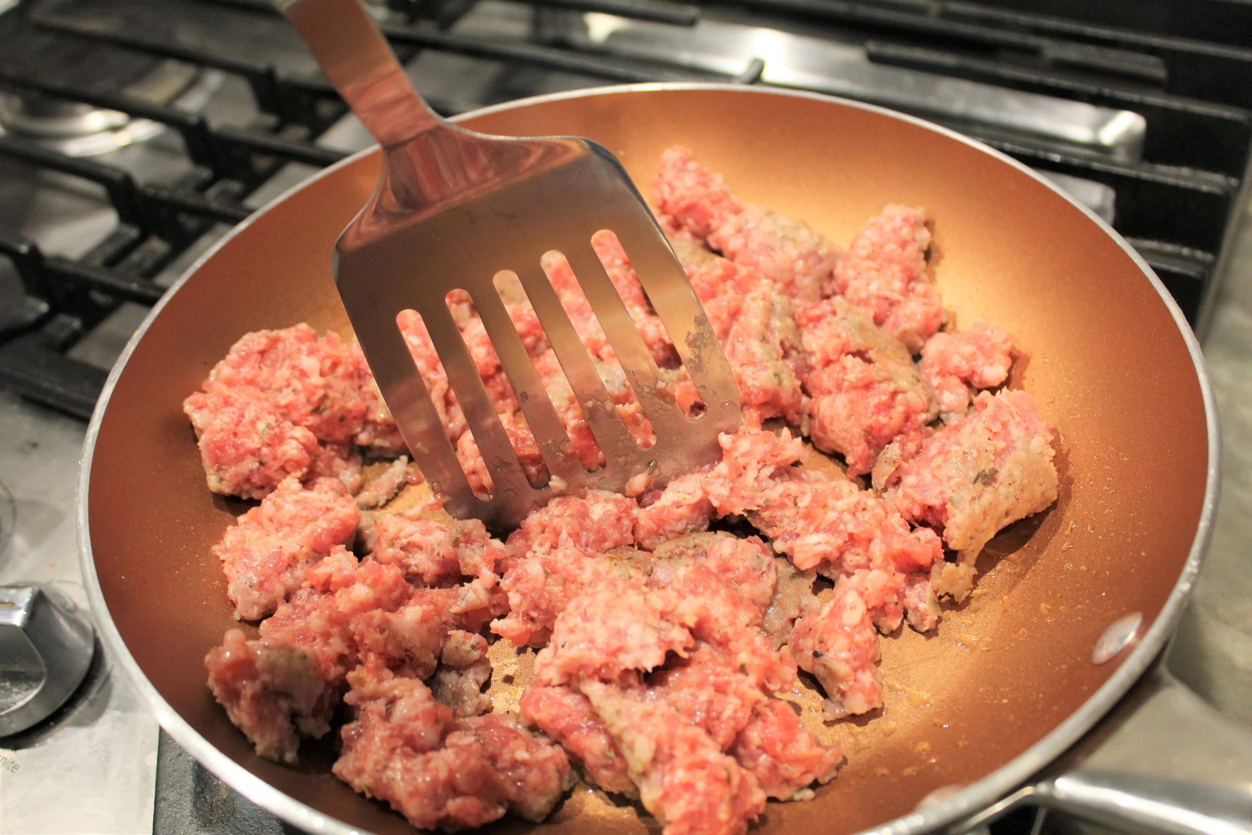 This is an easy and delicious appetizer that can be served at any function. Anytime my friend has a get together at her house, she always has jalapeno poppers ready for everyone to eat. You might think these are really spicy since it is stuffed jalapenos, but you can control the spice by removing all or some of the seeds. The heat of peppers come from the seeds. Whenever you are dealing with peppers, you want to always use gloves. Trust me, I had to learn this the hard way. One day I made 50 poppers and did not use gloves, my hands were burning by the end of the night. If you don’t want your hands to burn, wear gloves. The jalapenos are stuffed with pork sausage but you could use ground turkey to make it a little more healthy. Brown some pork sausage (breakfast sausage as some would call it) in a pan. Make sure it is completely cooked.