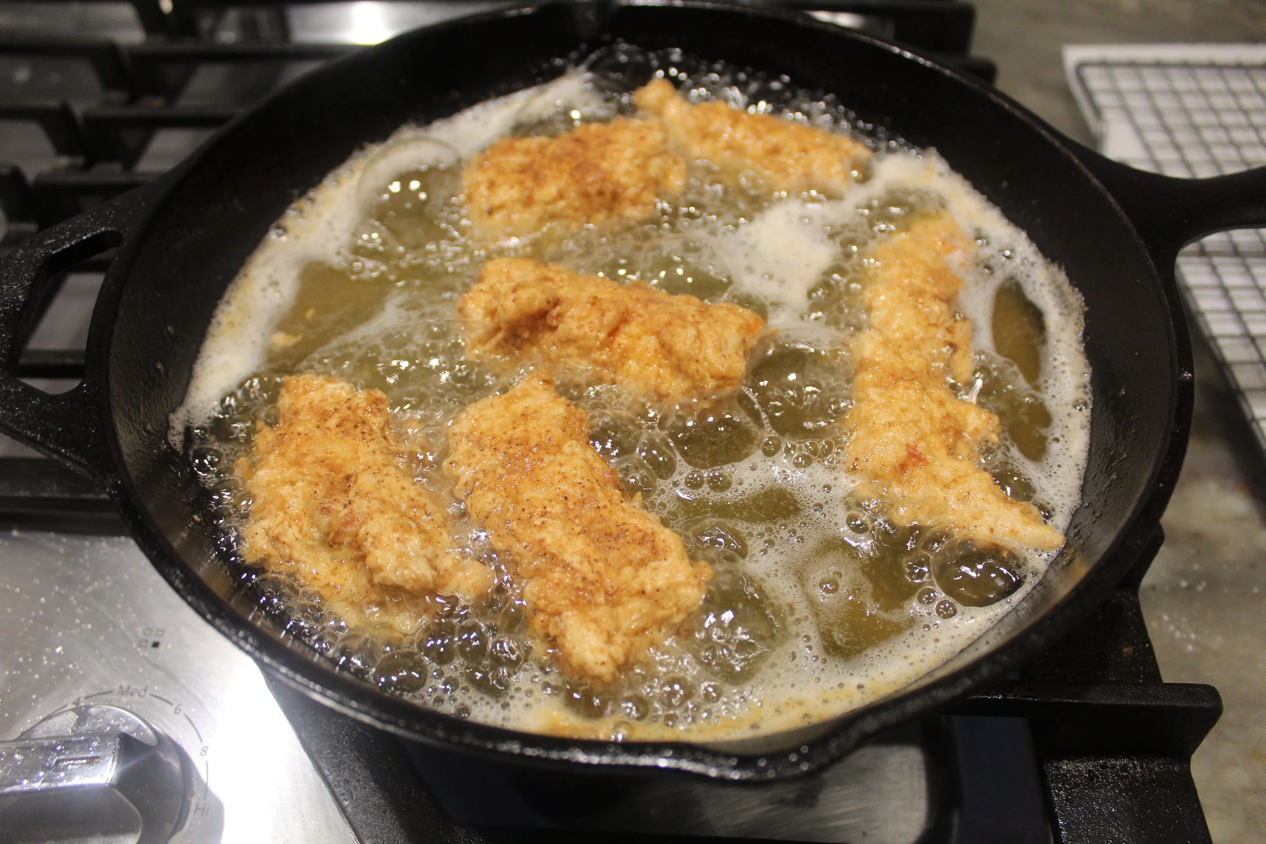 - Heat the vegetable oil in a skillet until it reaches the temperature of 350 degrees.
