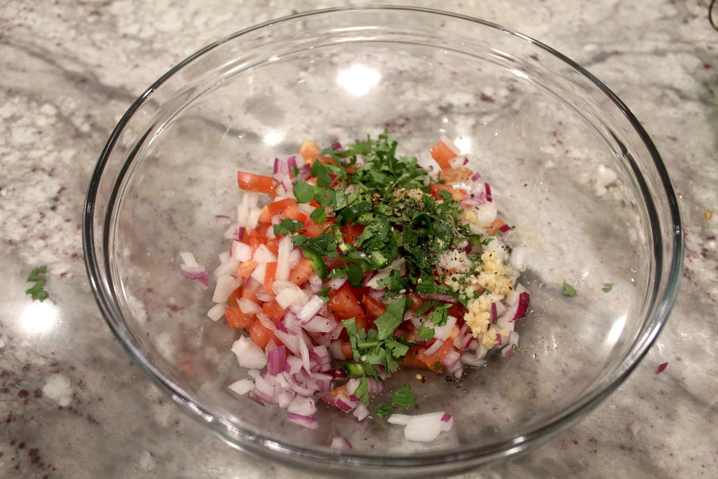 - In a bowl add the diced tomato, red onion, white onion, diced jalapeno, chopped cilantro, lime juice, minced garlic and salt & pepper. Stir well.