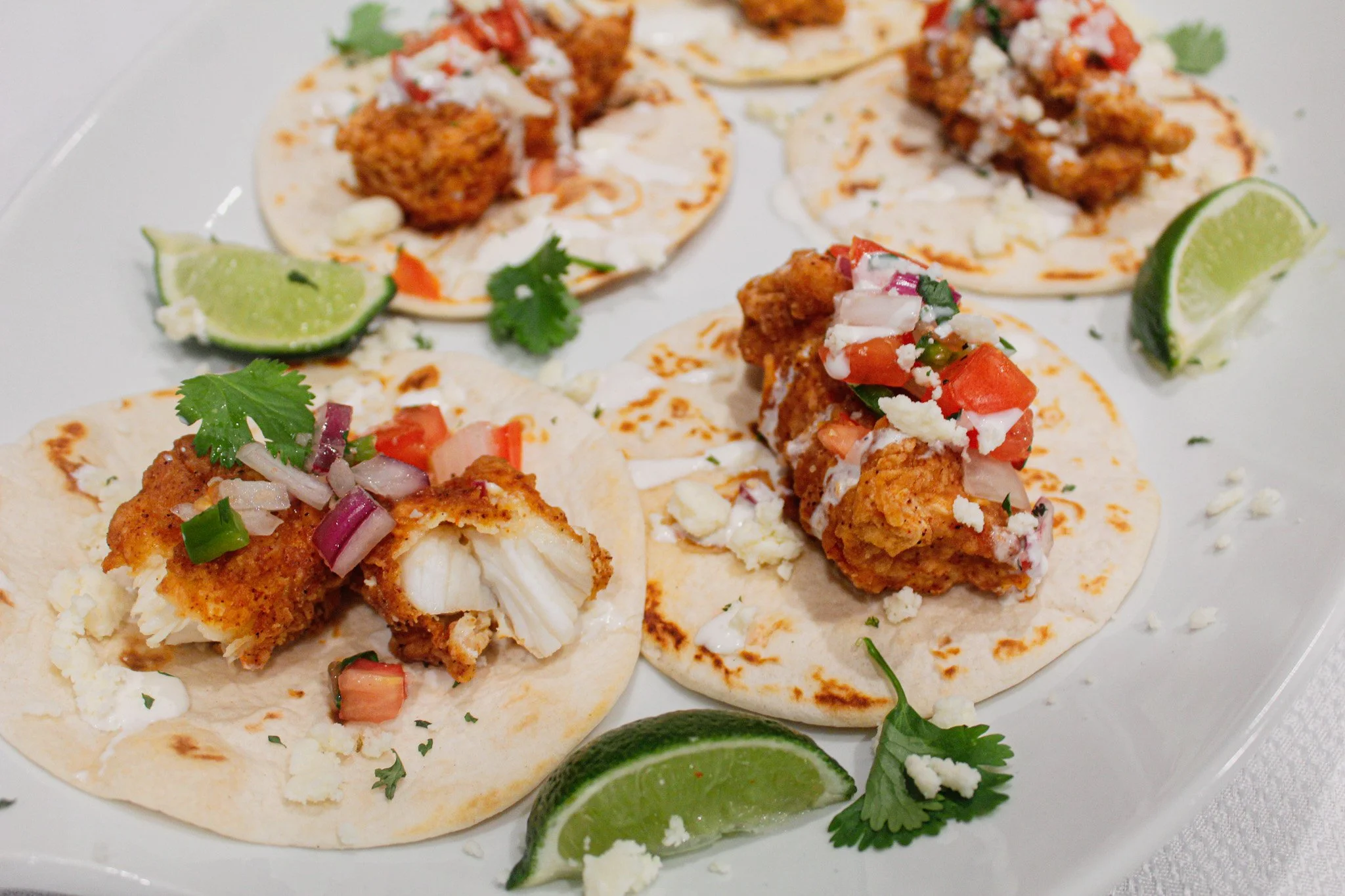 Assemble the tacos by adding the fried crab and top with the pico de gallo, queso fresco cheese and crema. Serve and ENJOY!