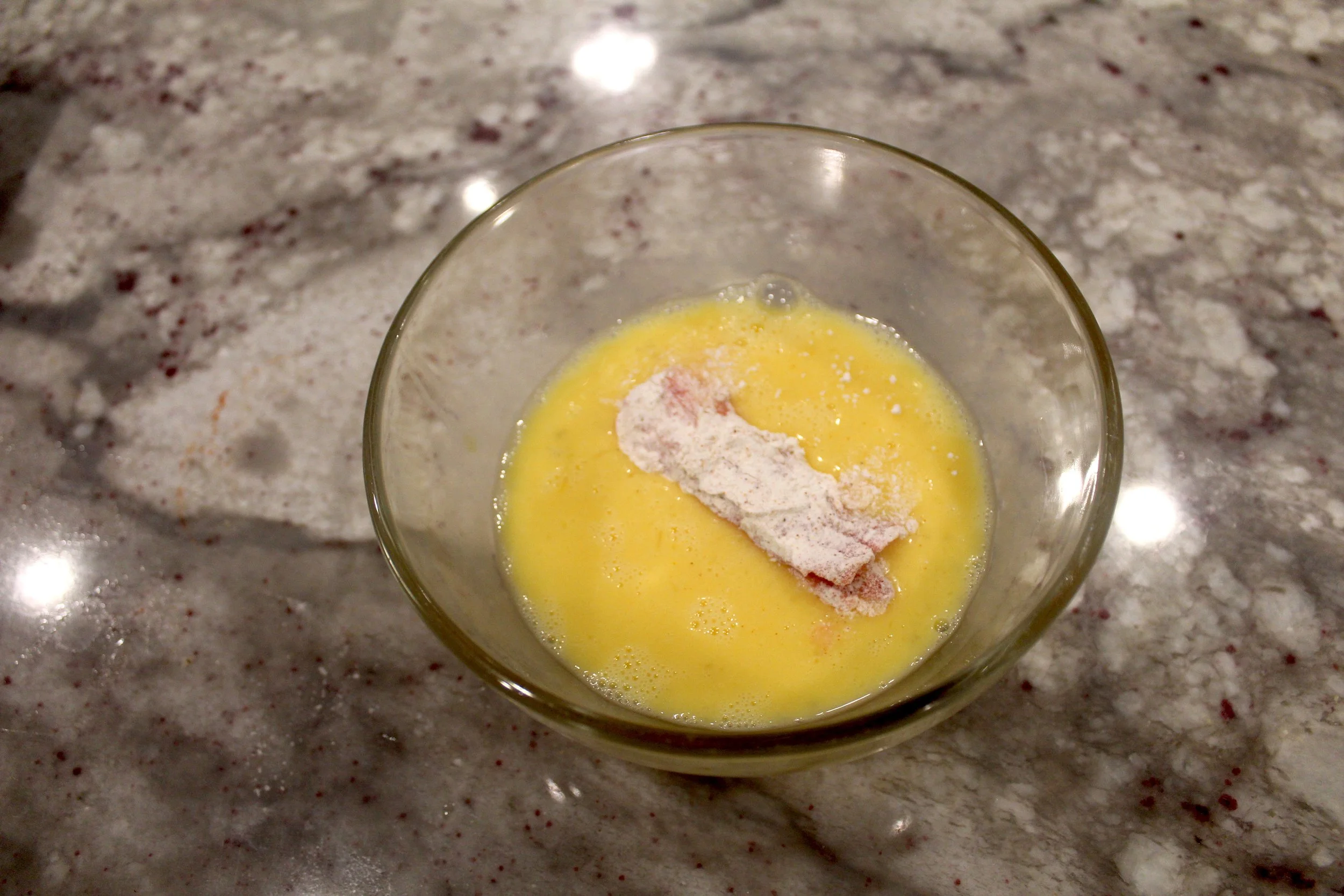 Add the crab meat to the eggs and then coat in the flour. Make sure it is fully coated. Repeat until you have the desired amount of coating on each piece of crab meat.
