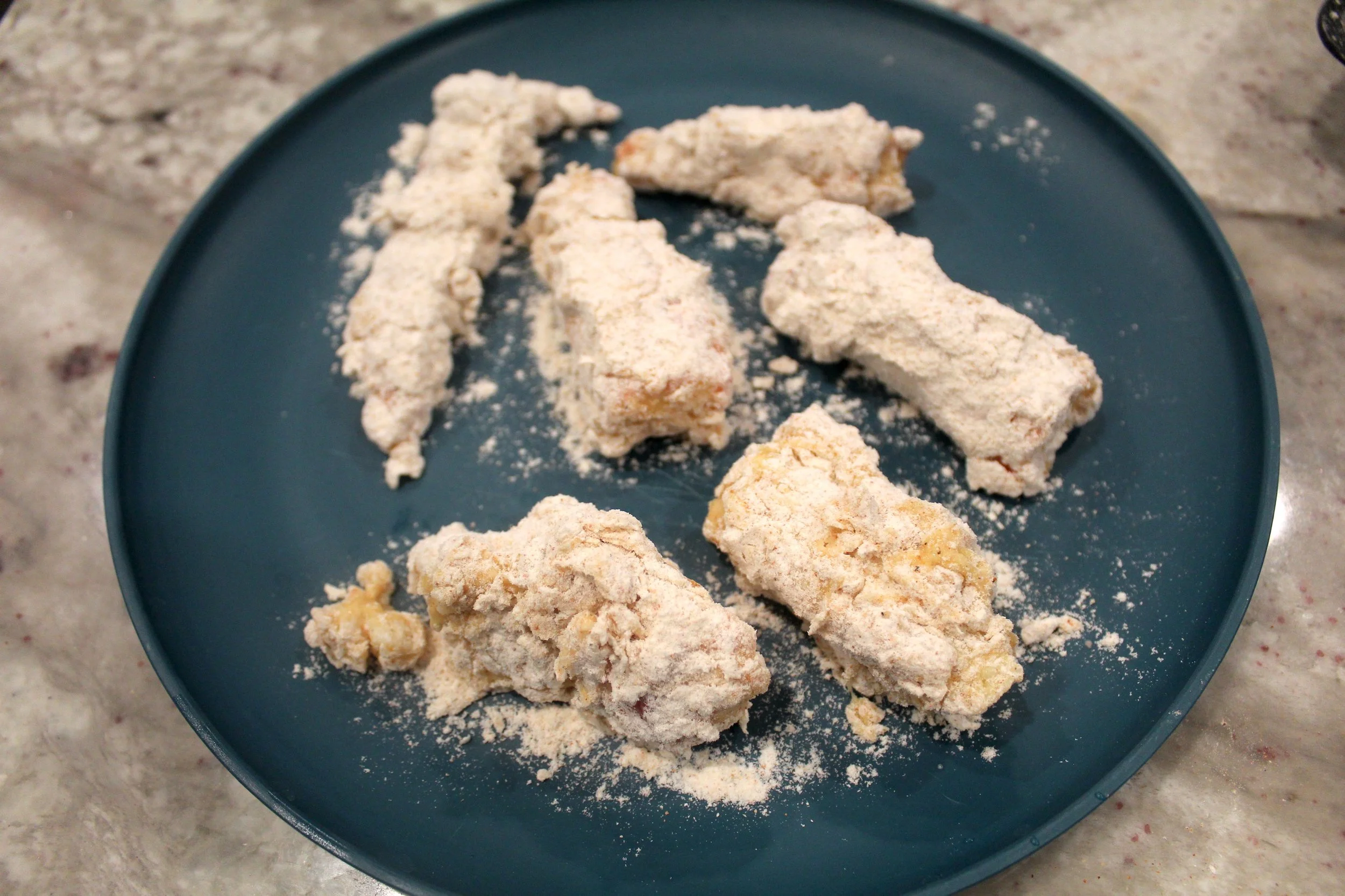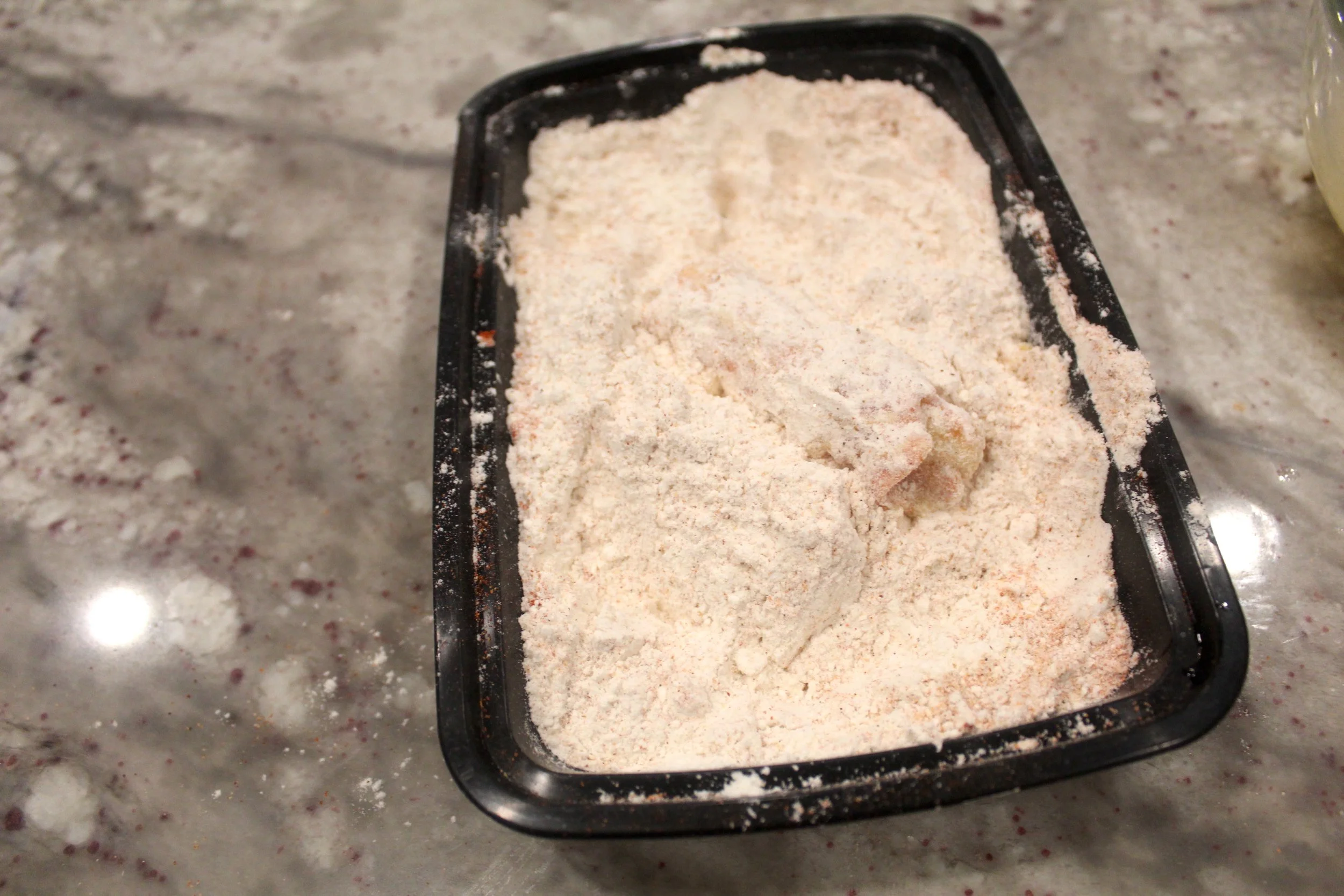 - In a separate bowl add the flour and season with cajun seasoning, onion powder, garlic powder and paprika.