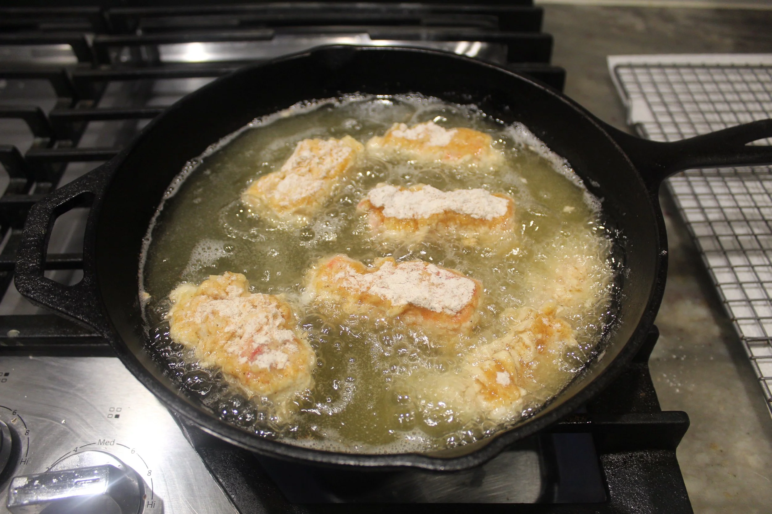 Heat 2-3 cups of vegetable oil in a cast iron until it reaches a temperature of 350 degrees. Add the crab meat and cook for 3-5 minutes or until the crab is golden brown. Set aside and remove any excess oil.