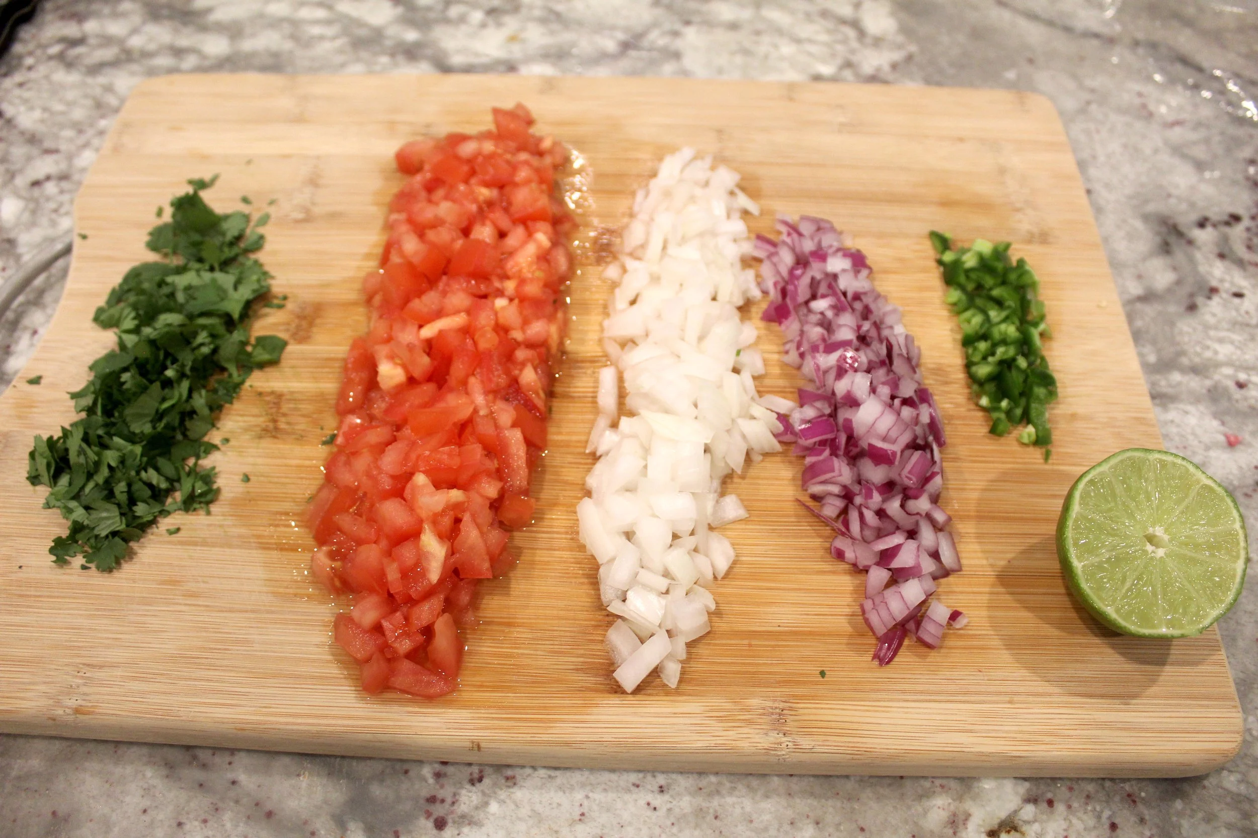 To add some freshness to the tacos, I made a light and refreshing pico de gallo. Add 1 large diced tomato (or 2 medium sized tomatoes), 1/3 cup of red onion, 1/3 cup of white onion, 1/2 fresh jalapeno (take out the seeds if you do not like spice), 1/4 cup of fresh chopped cilantro, juice of 1/2 lime, 1 tsp of minced garlic and salt & pepper to taste. Stir well.