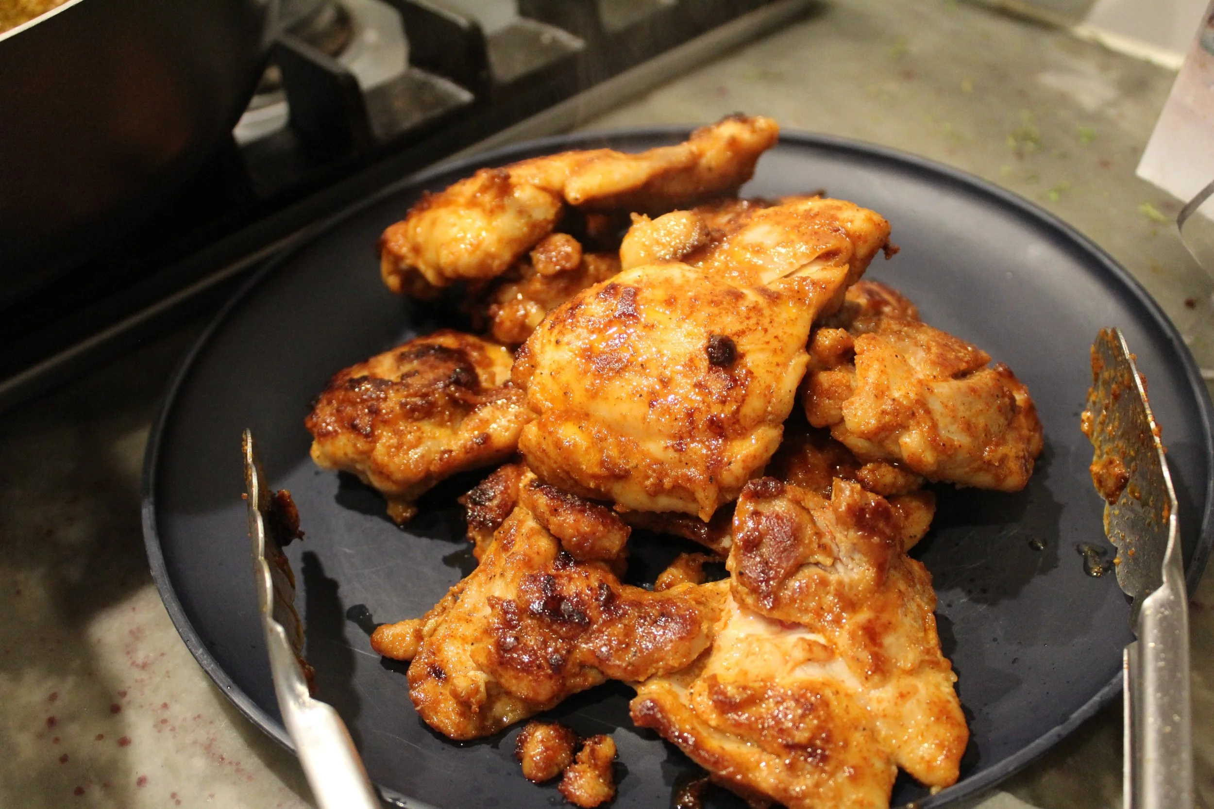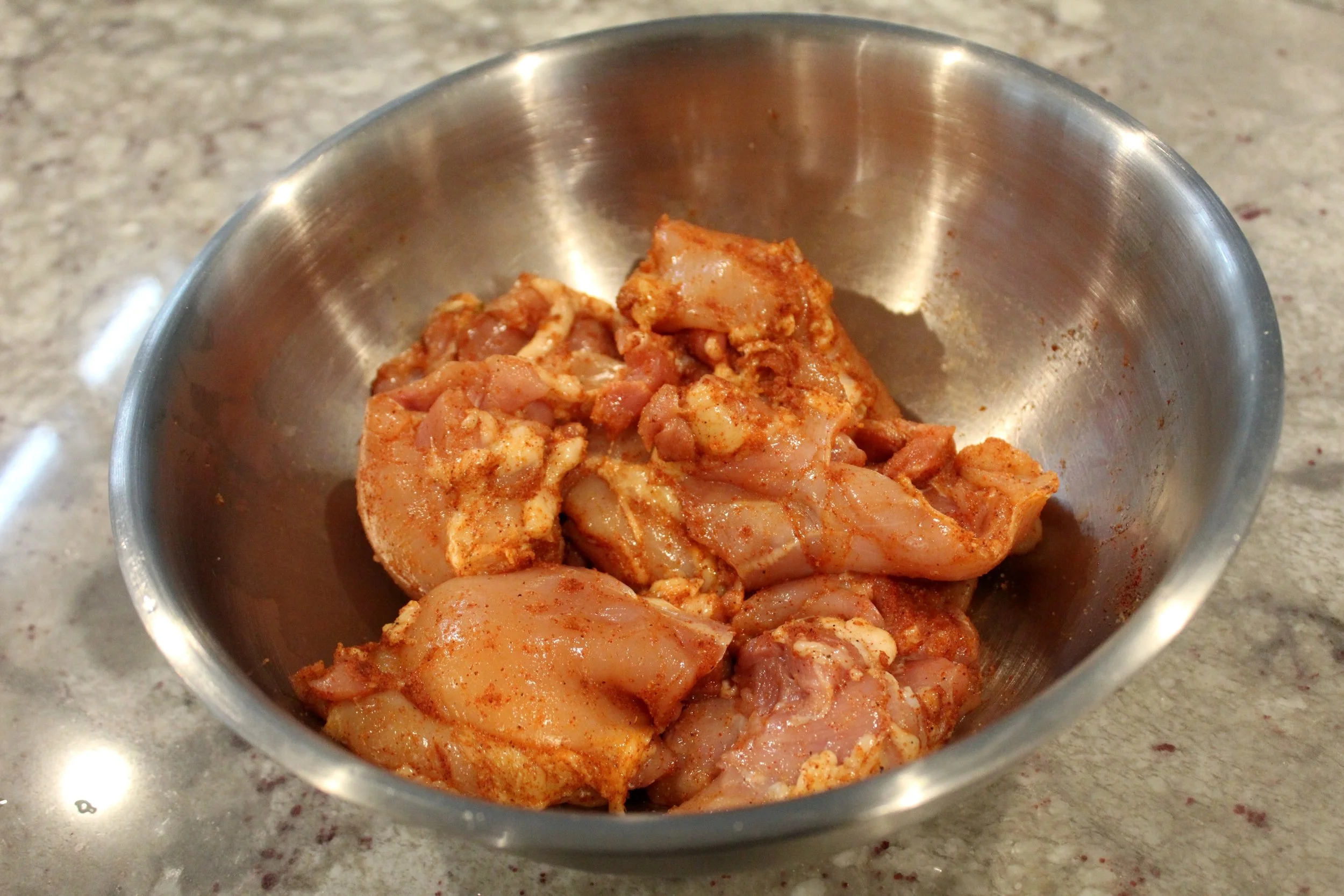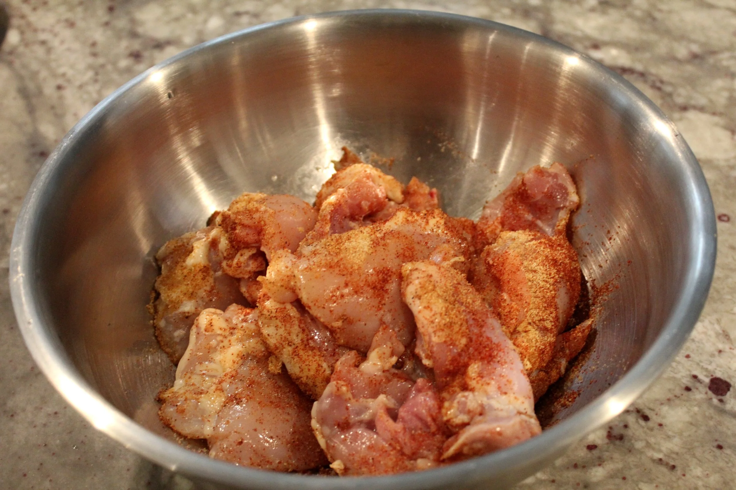 - Season chicken thighs with 1 tbsp of vegetable oil, 1 tbsp of onion powder, 1 tbsp of garlic powder, 1 tbsp of cajun seasoning and 1 tbsp of paprika and mix well. Make sure the chicken is fully coated in the seasoning and set aside.