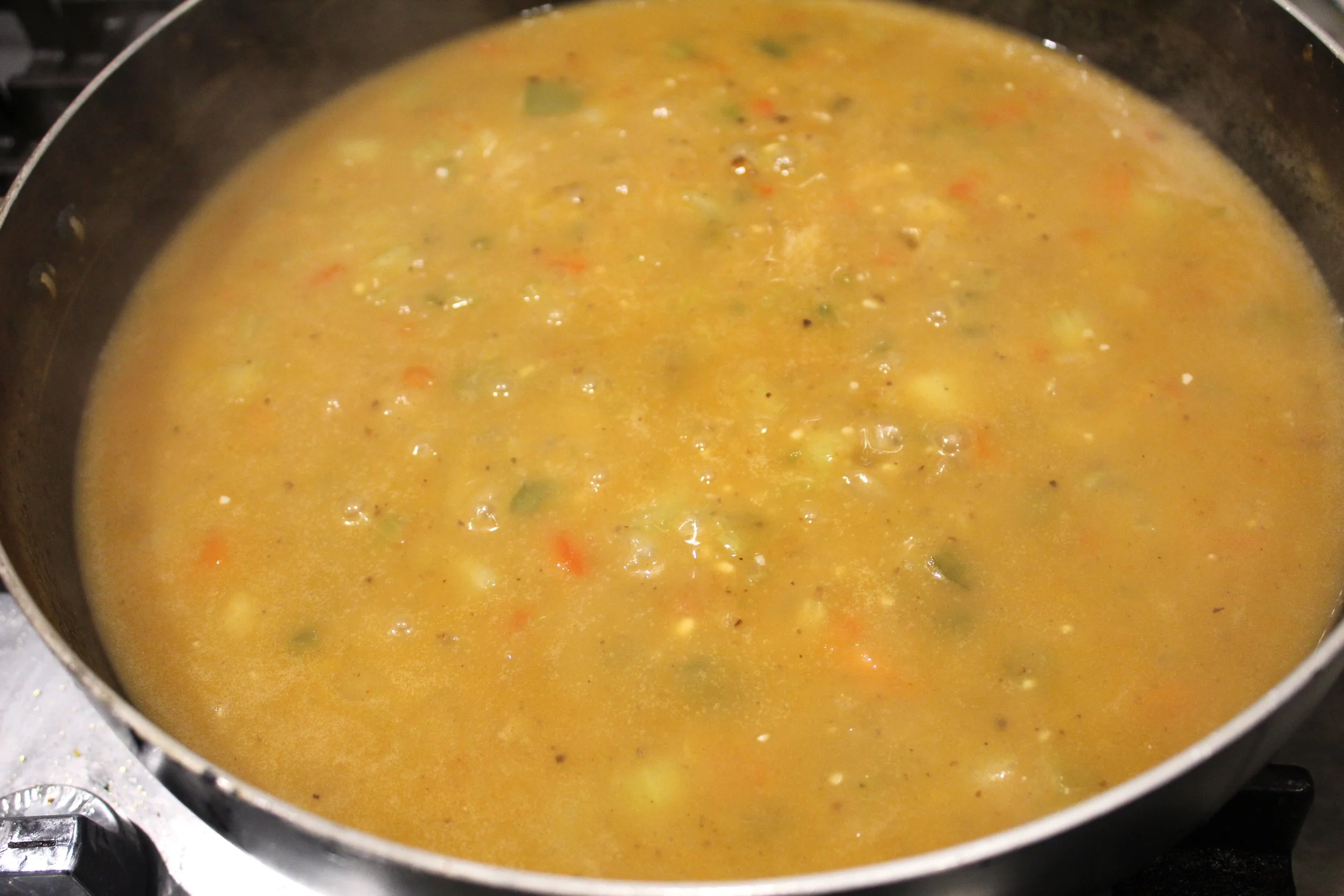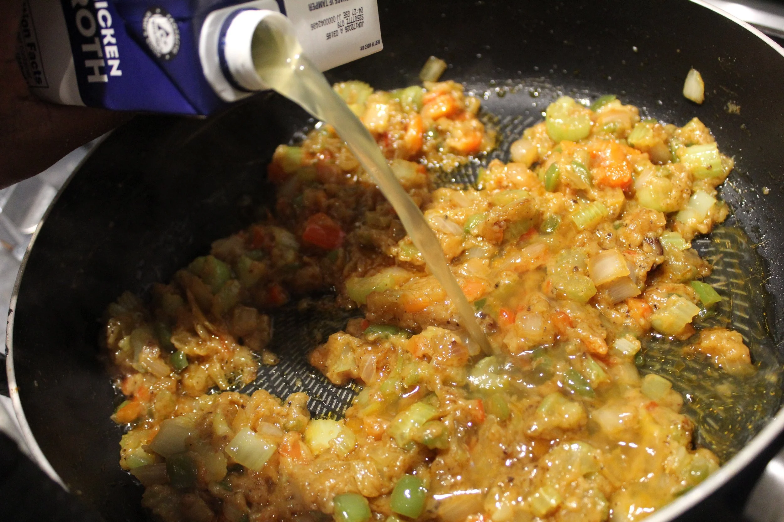 - Once the flour and veggies have turned a brown color, add 1/2 cup of chicken broth and stir. Mixing the broth in the flour and veggies until mixed in well. Cook for another 2 minutes and the veggies will get darker.