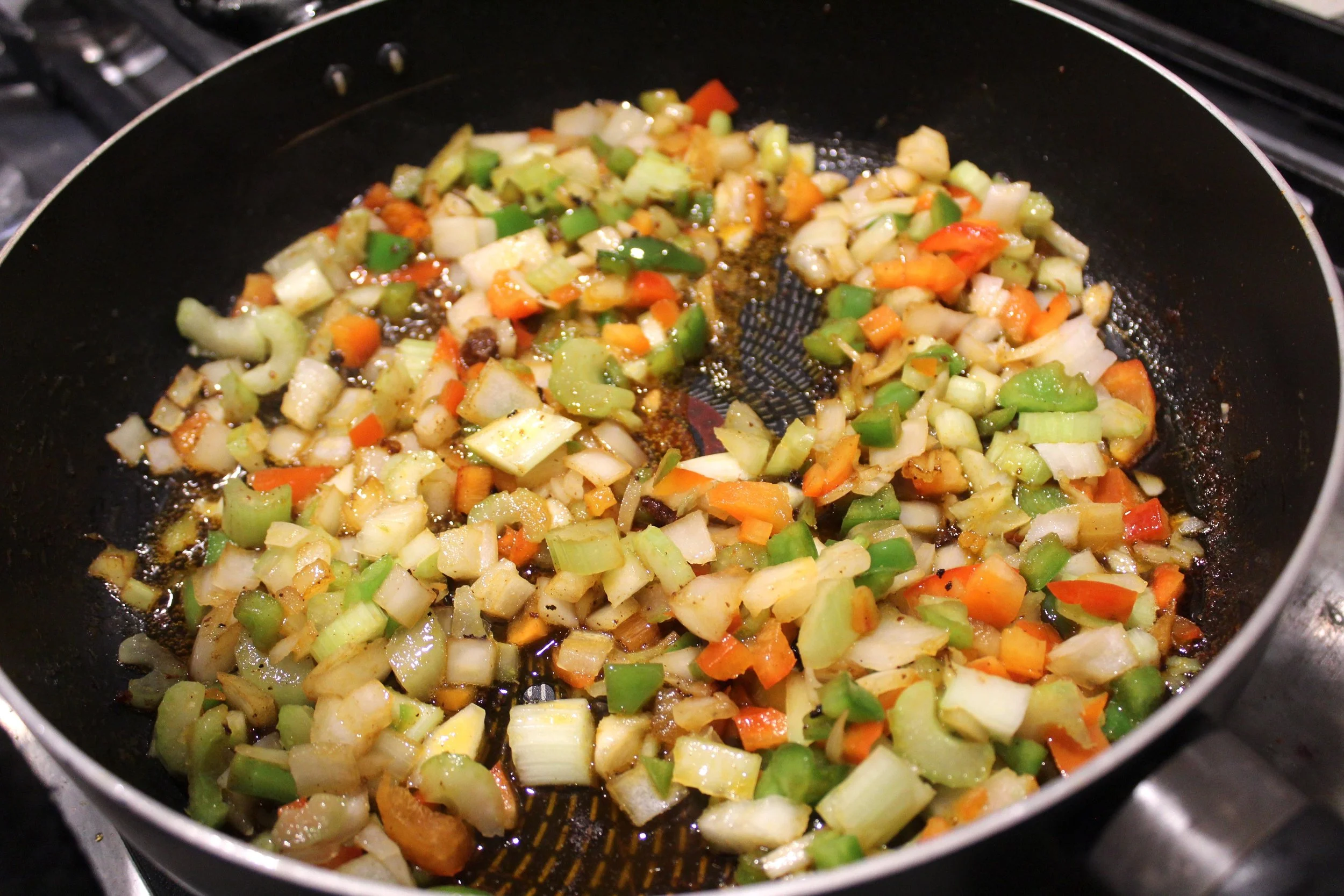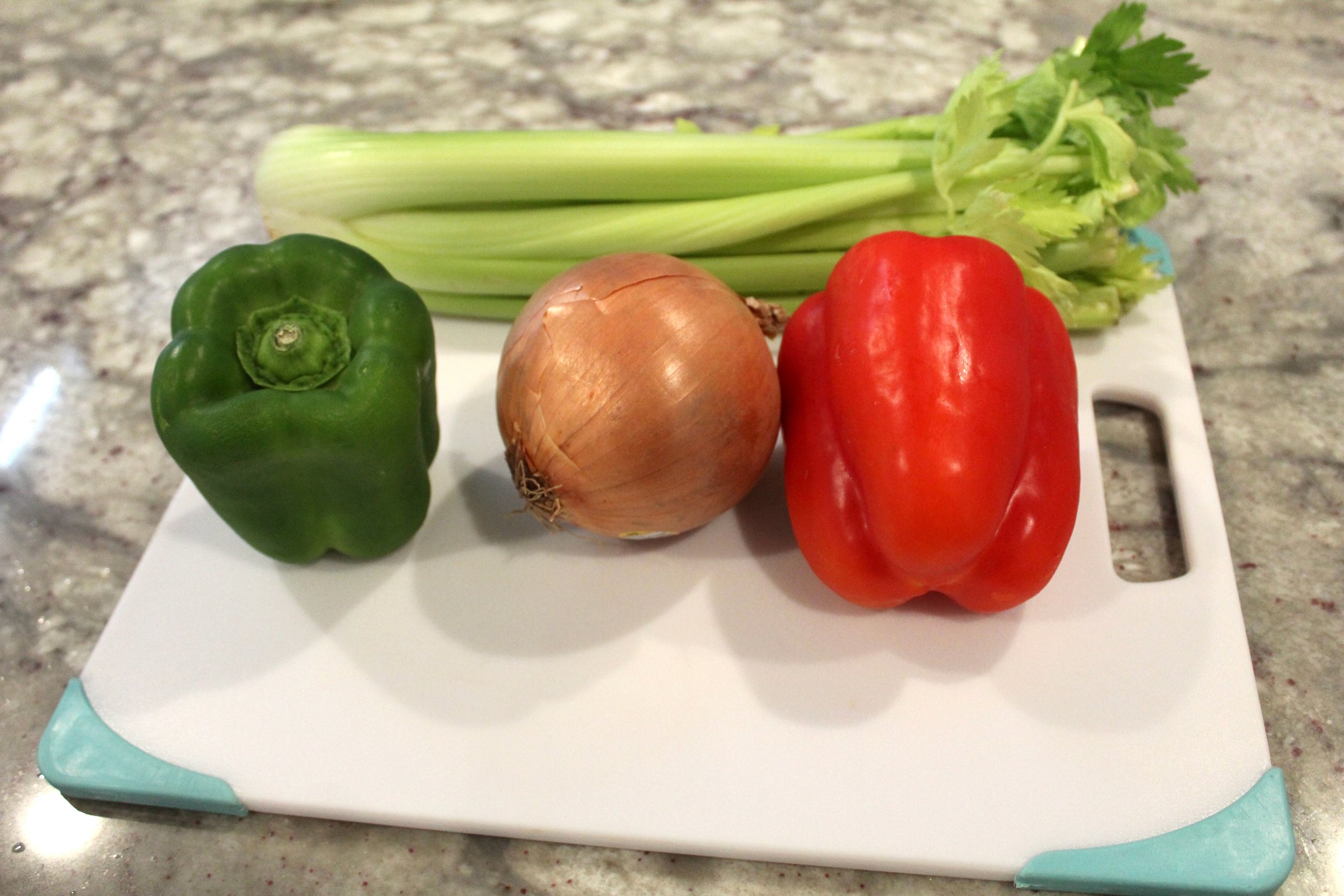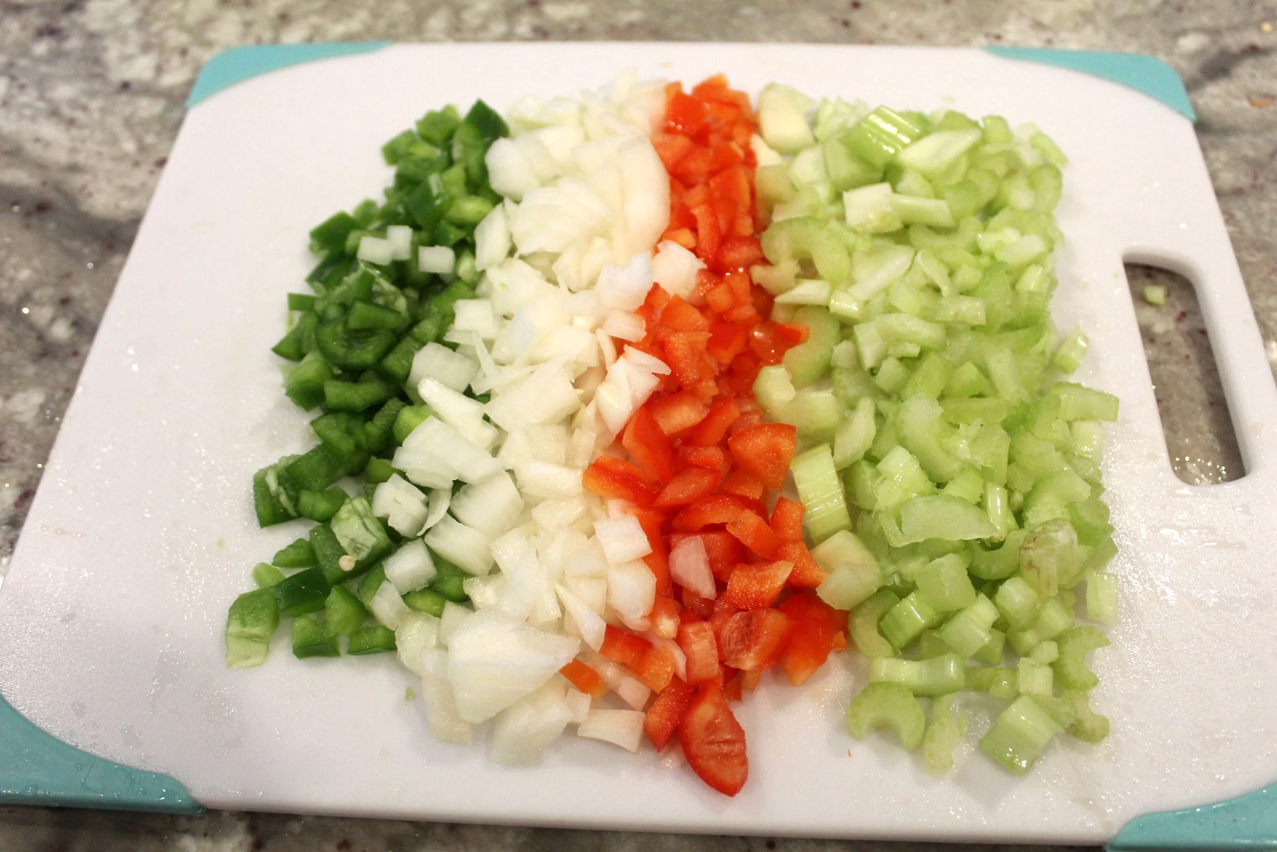 Dice 1/2 yellow onion, 1/2 green bell pepper, 1/2 red bell pepper and 3 celery stalks and set aside.
