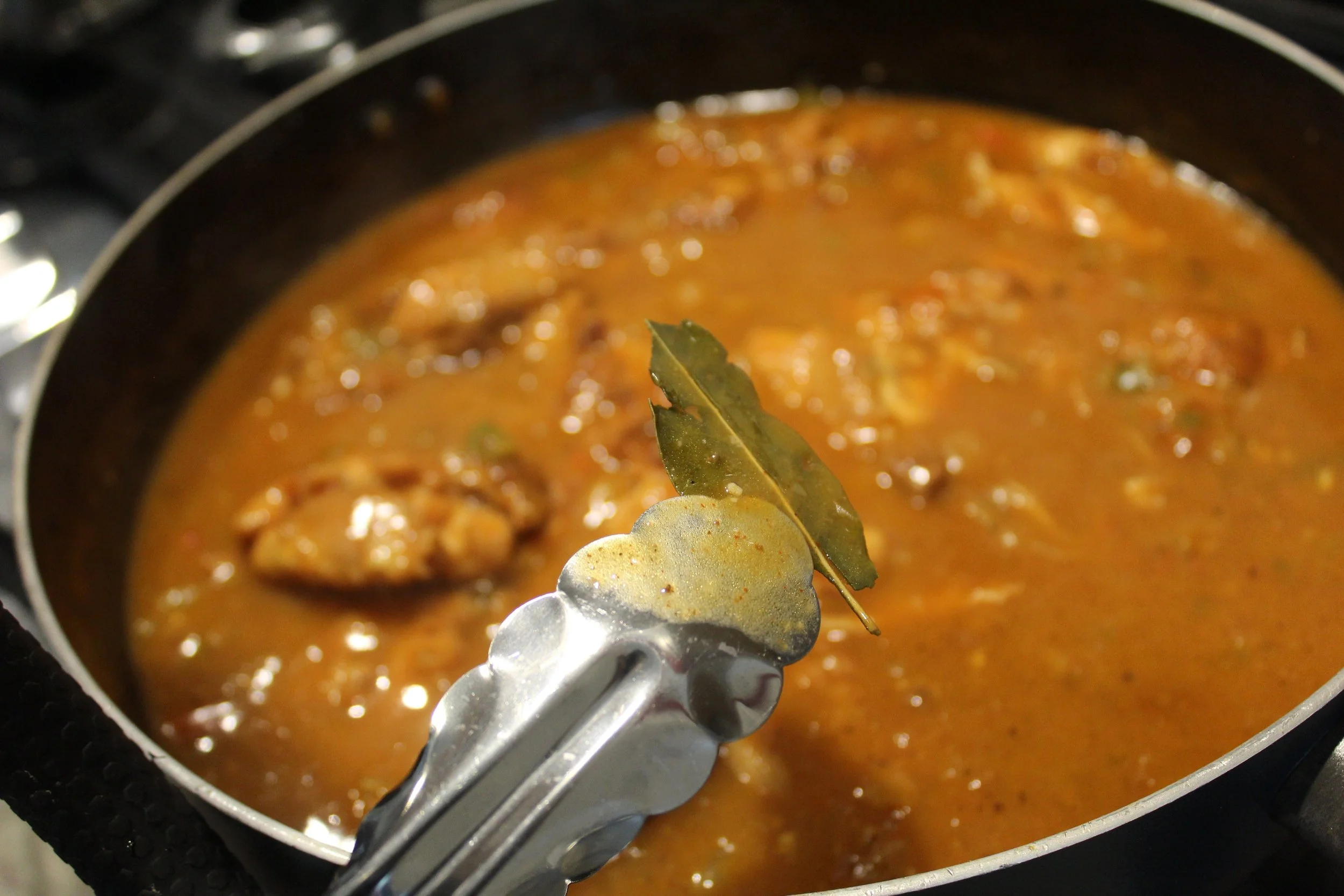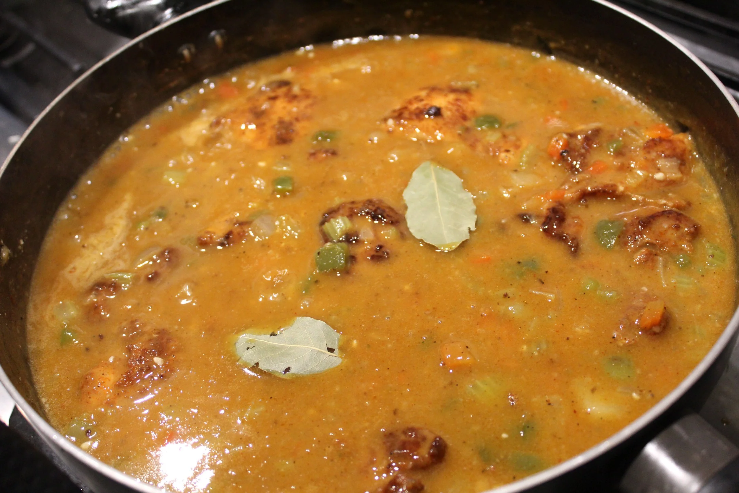 Add the chicken thighs back to the pot along with 2 bay leaves.