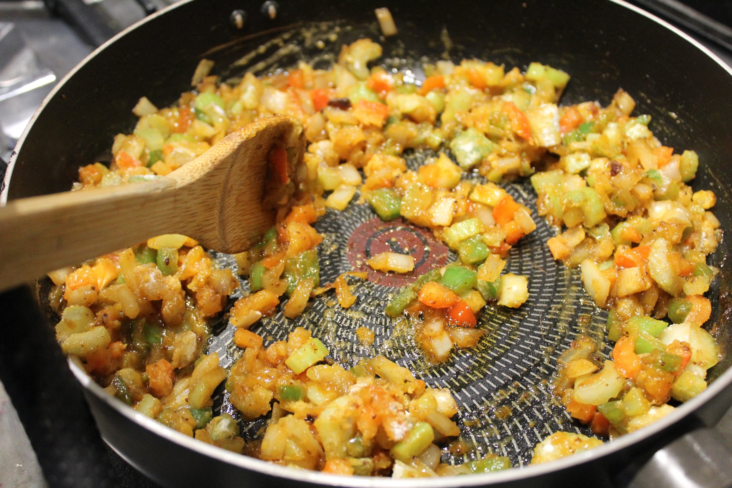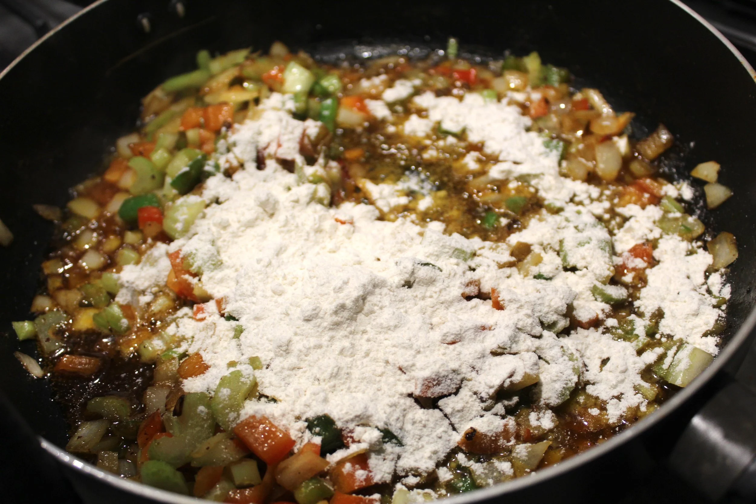 - Add flour to veggies and stir well. Cook for 5-7 minutes or until the flour and veggies turn a brown color.