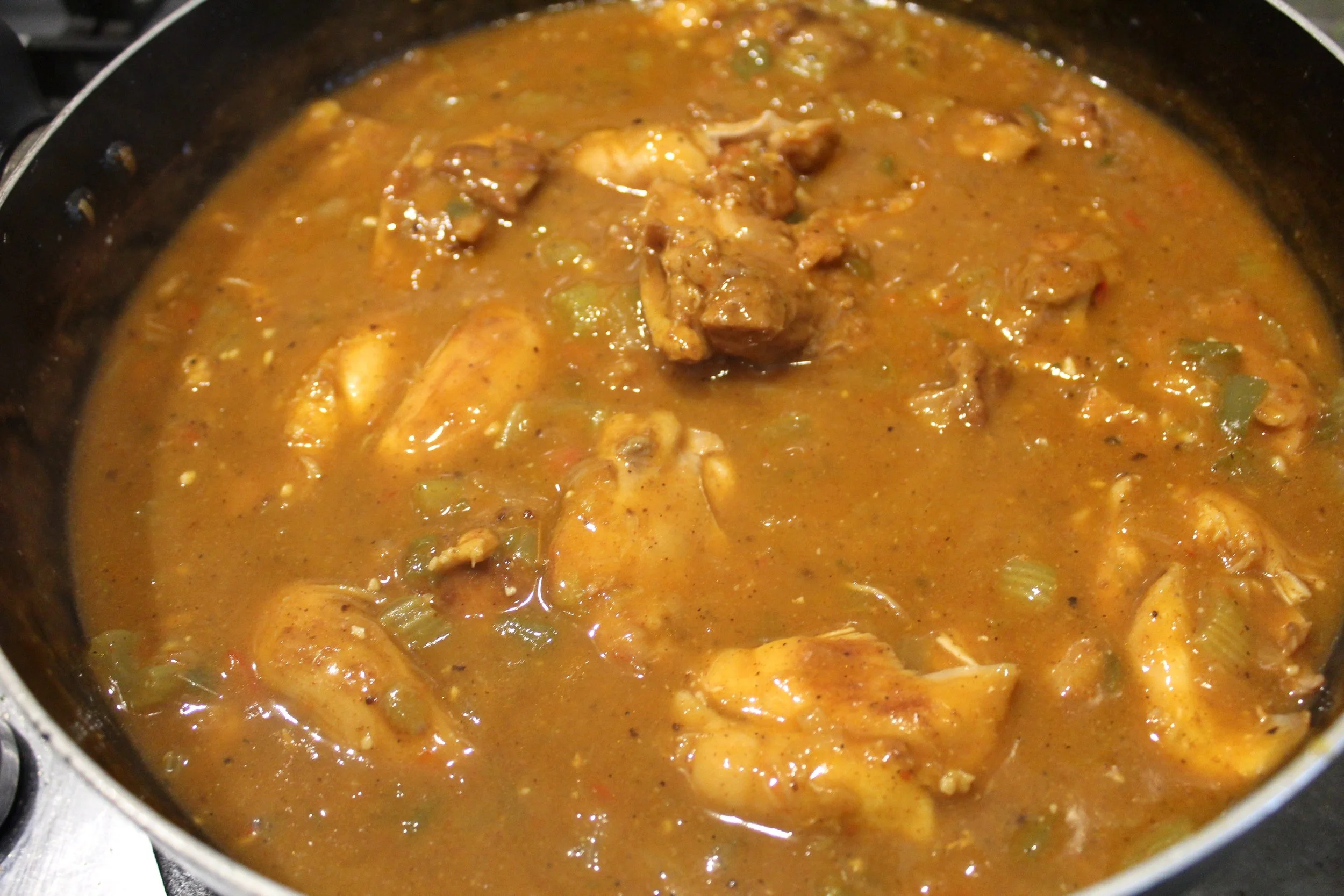 Seasoned boneless, skinless chicken thighs smothered in a thick roux-based sauce with veggies and served over rice.