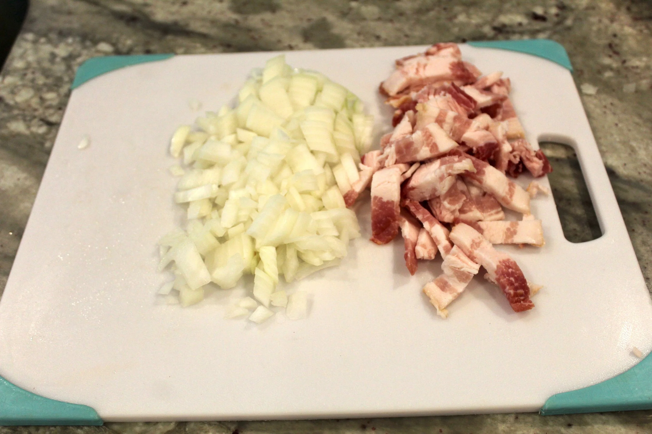 - Chop the bacon into small pieces and dice the onion and set aside.
