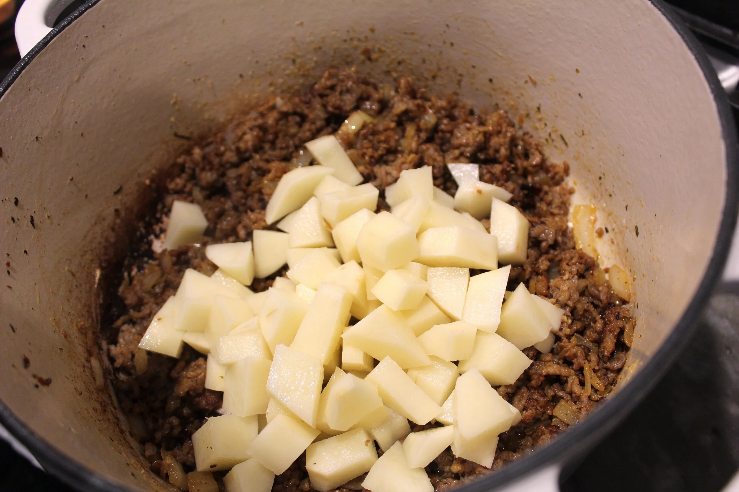 Add the washed, peeled and chopped potatoes and 6 cups of chicken broth to the pan and stir.