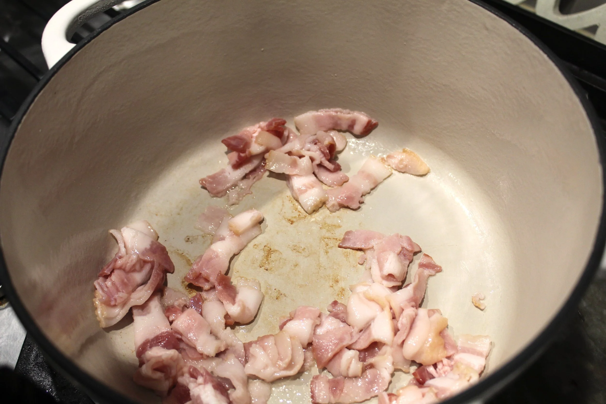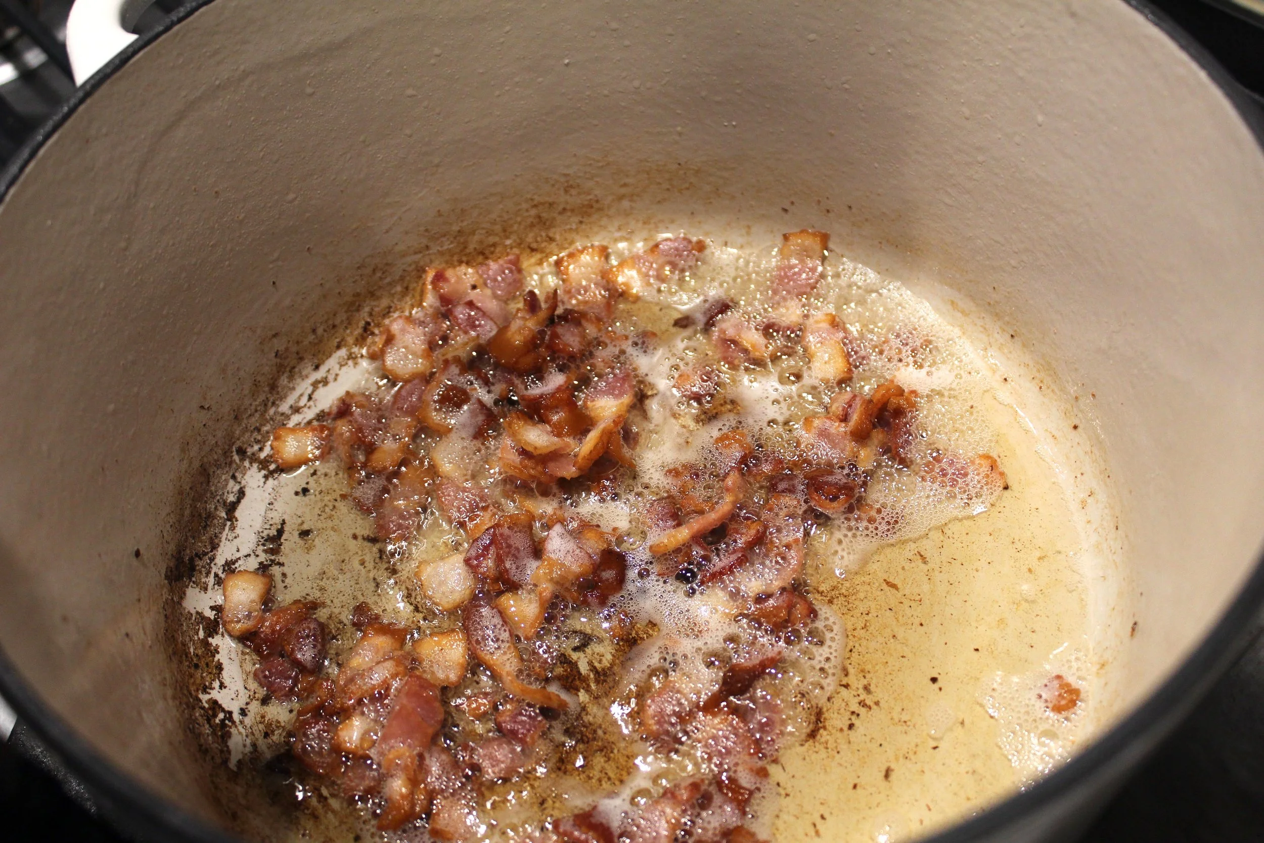 - Fully cook the bacon pieces and set aside.