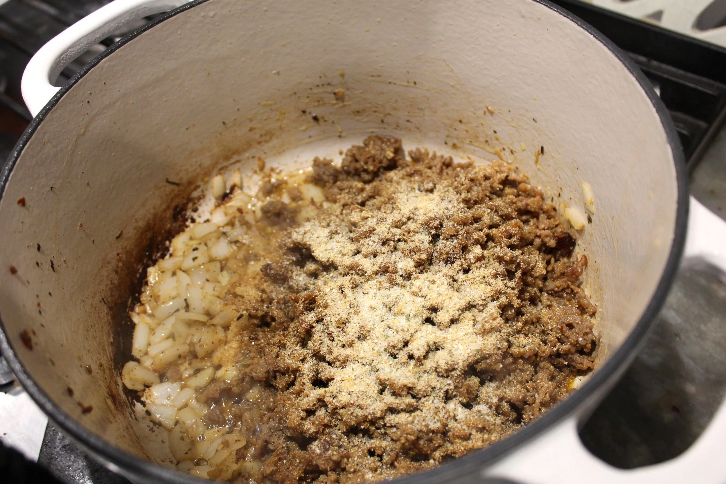 - Add the cooked sausage back to the pan. Season with onion powder, garlic powder, cajun seasoning, dried oregano and garlic salt and stir well.