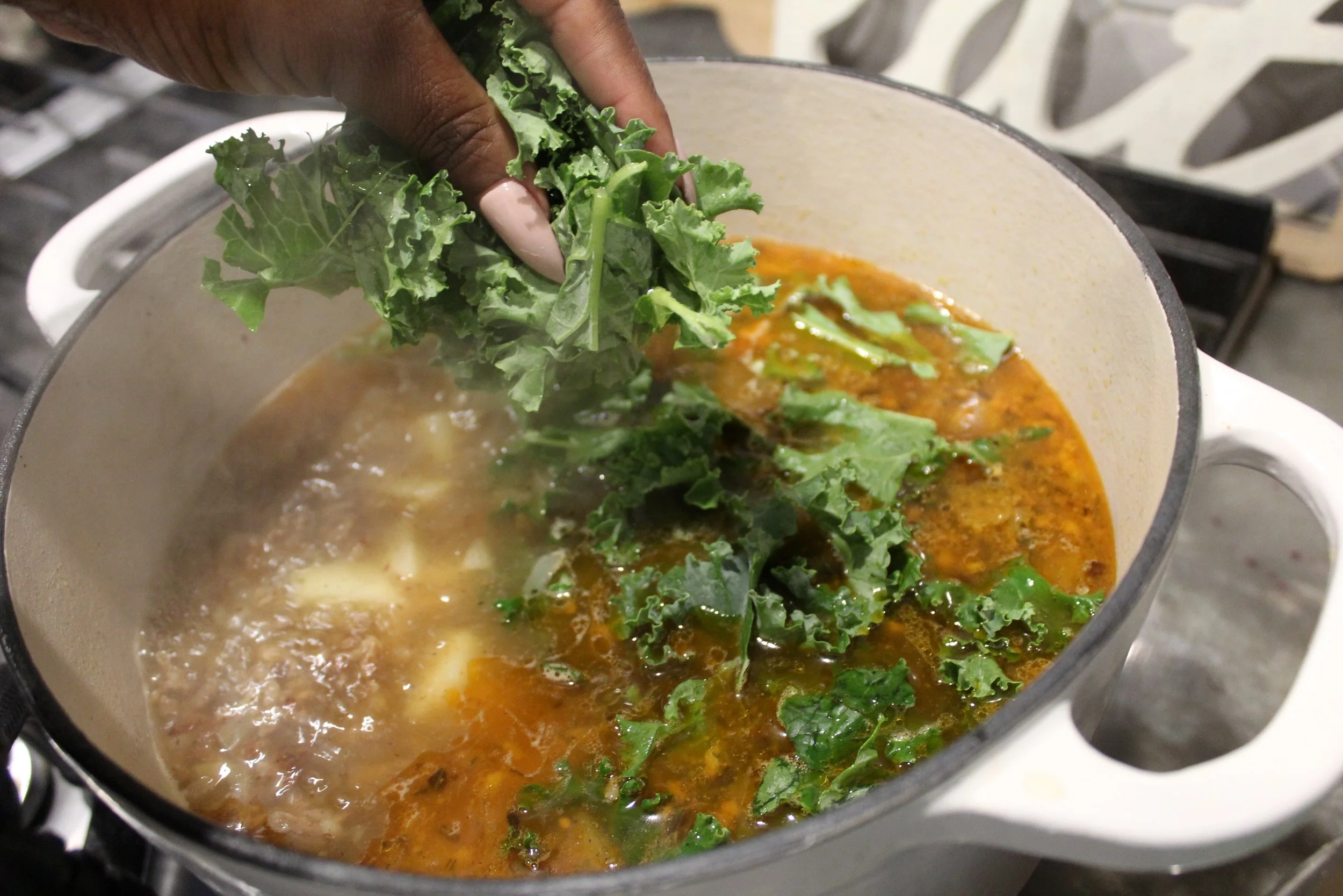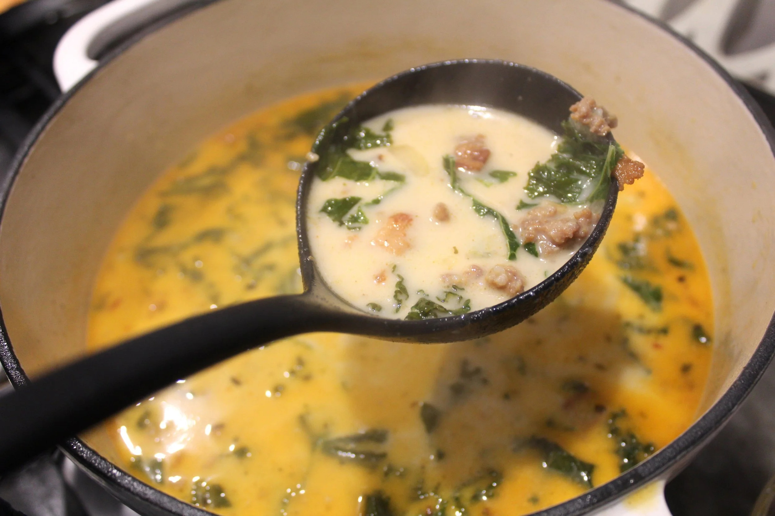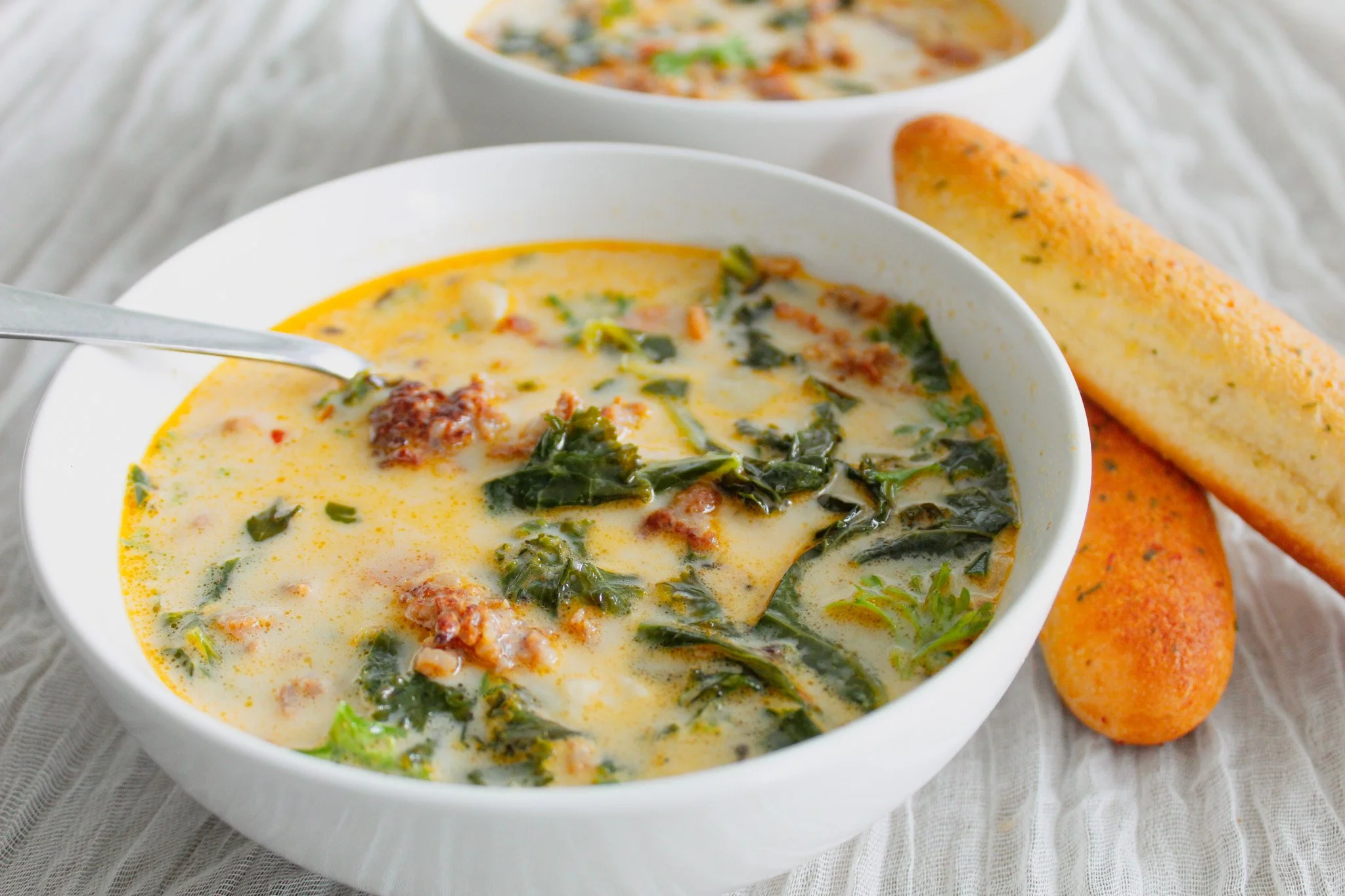 A creamy and flavorful soup with hot Italian sausage, bacon, potatoes and kale simmered in a rich broth.