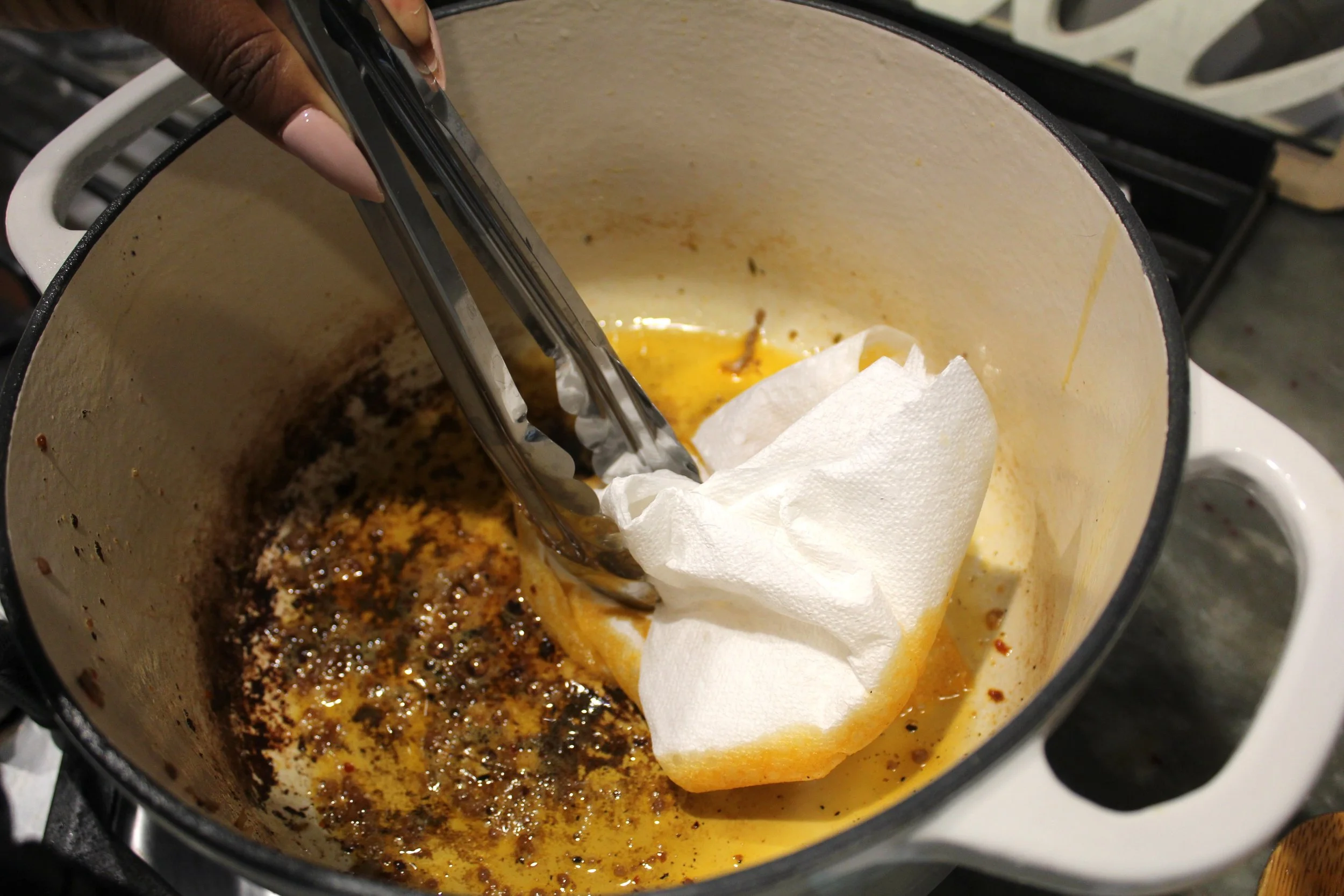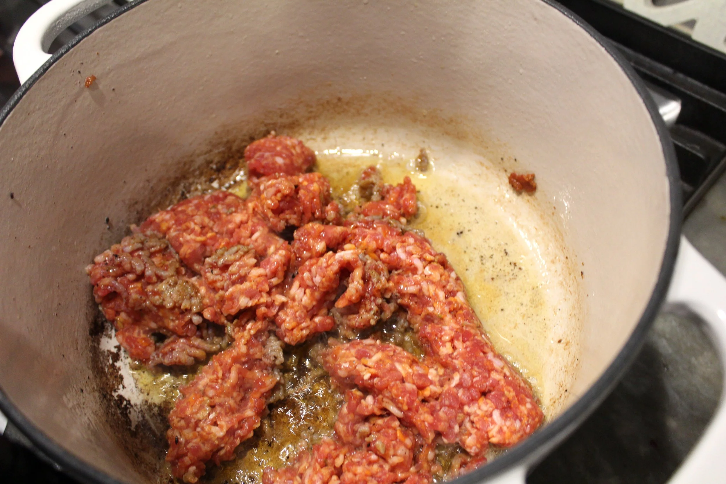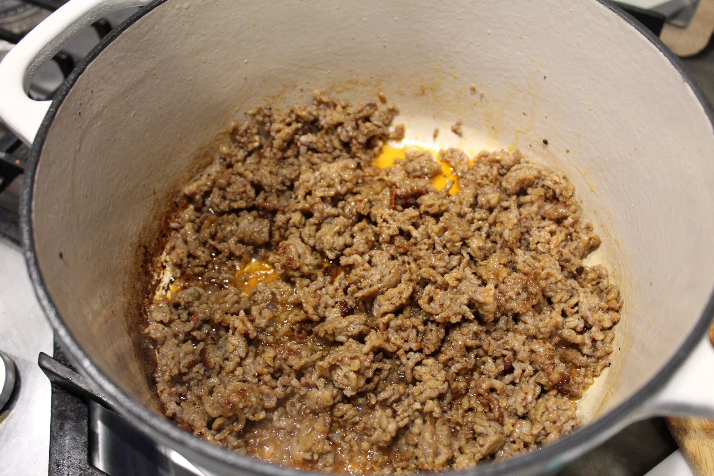- Add the package of hot italian sausage to the same pan and fully cook. Once cooked, set aside and use tongs and a paper towel to remove the excess oil from the sausage.