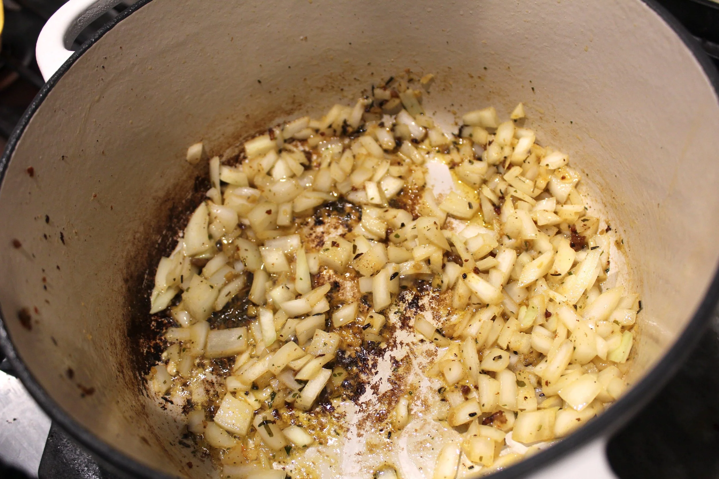- In the same pan, add butter. Once the butter has melted add minced garlic and diced onion and cook until the veggies are soft.