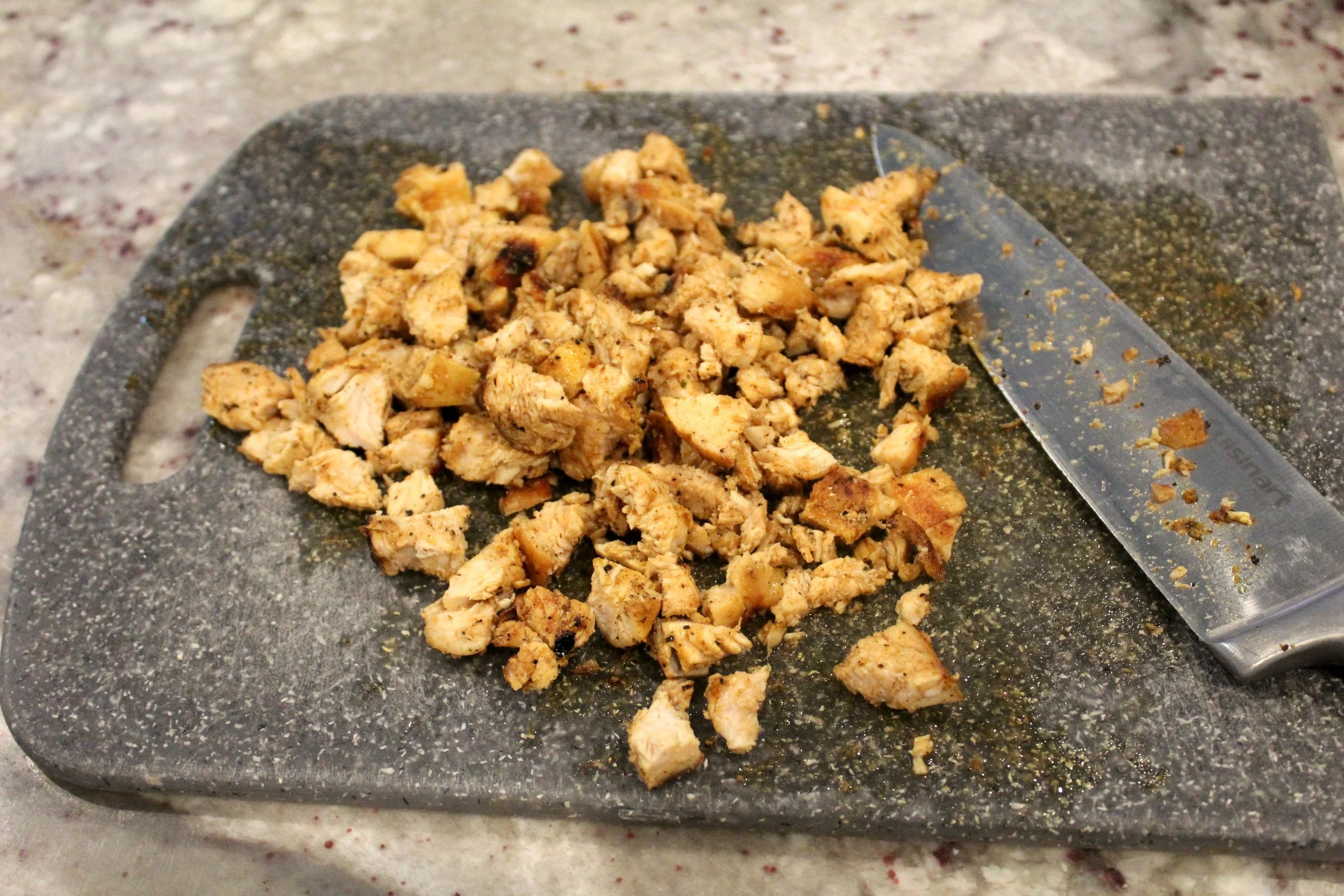 Chop one of the chicken breasts into small pieces. Slice the other chicken breast to place on top of the pasta salad and set aside.
