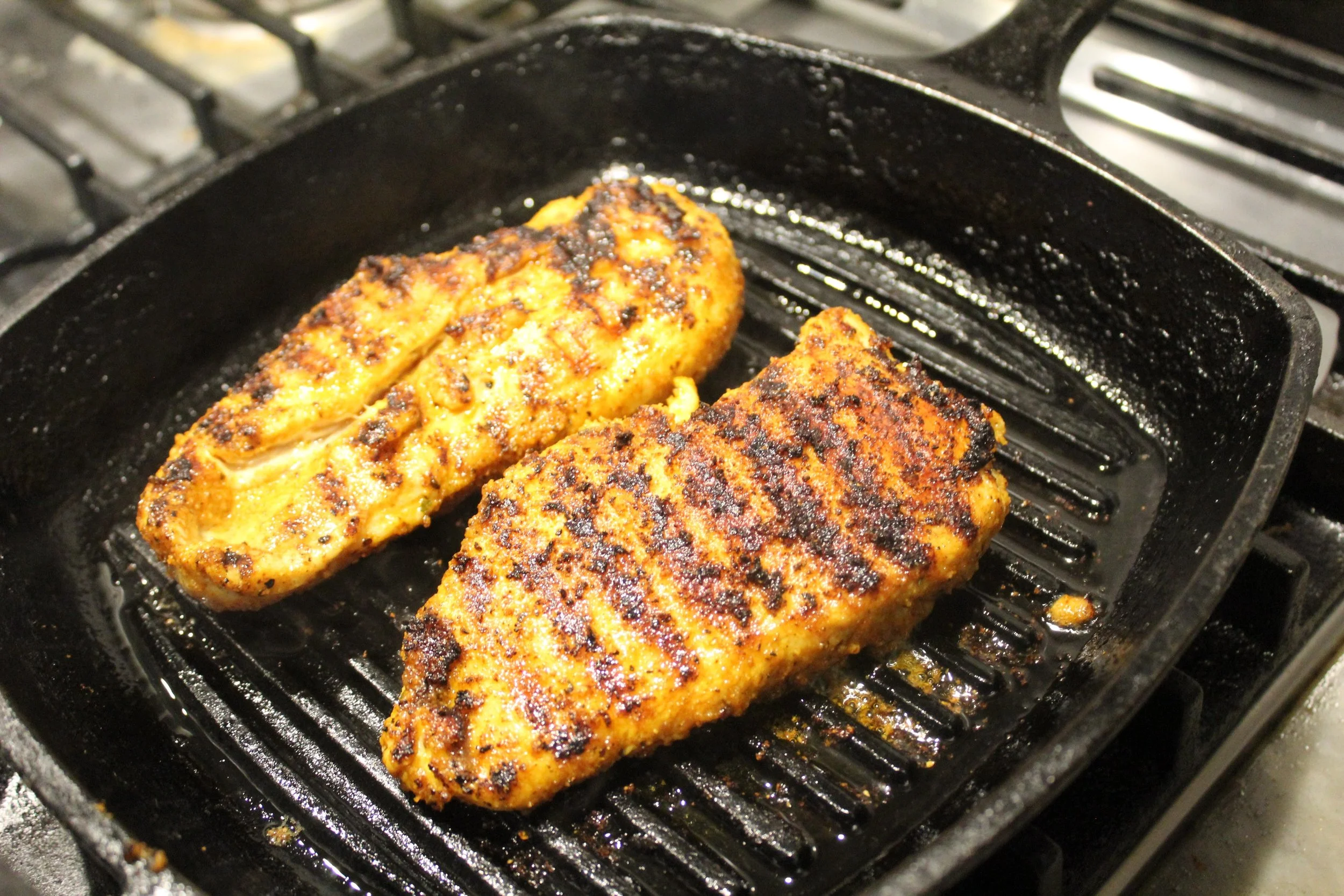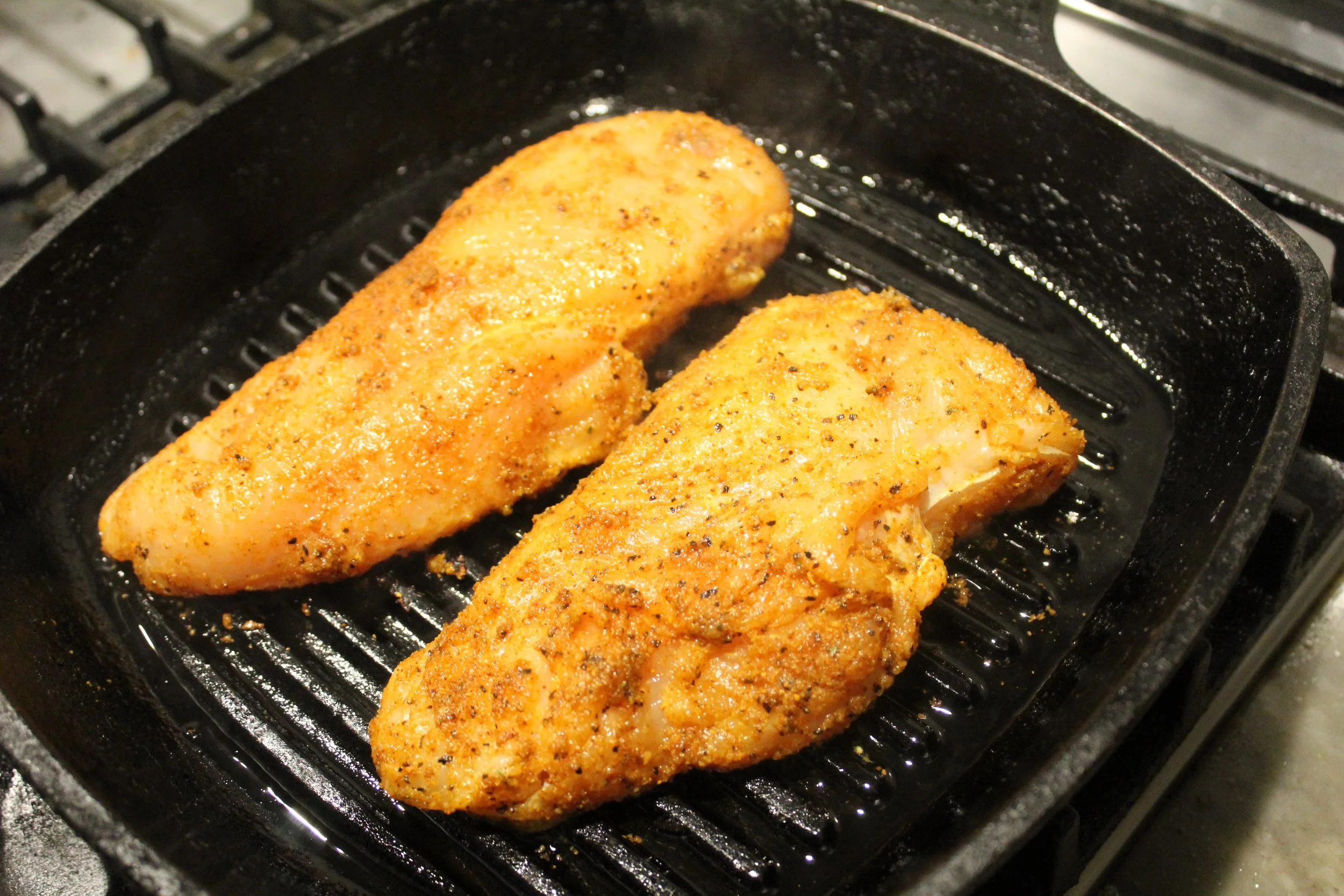- Add 1 tbsp of olive oil to a cast iron griddle pan. Once the pan is hot, add the chicken breasts. Cook 5-7 minutes on each side or until the internal temperature reaches 165 degrees. Once fully cooked, remove from the skillet and set on a cutting board.