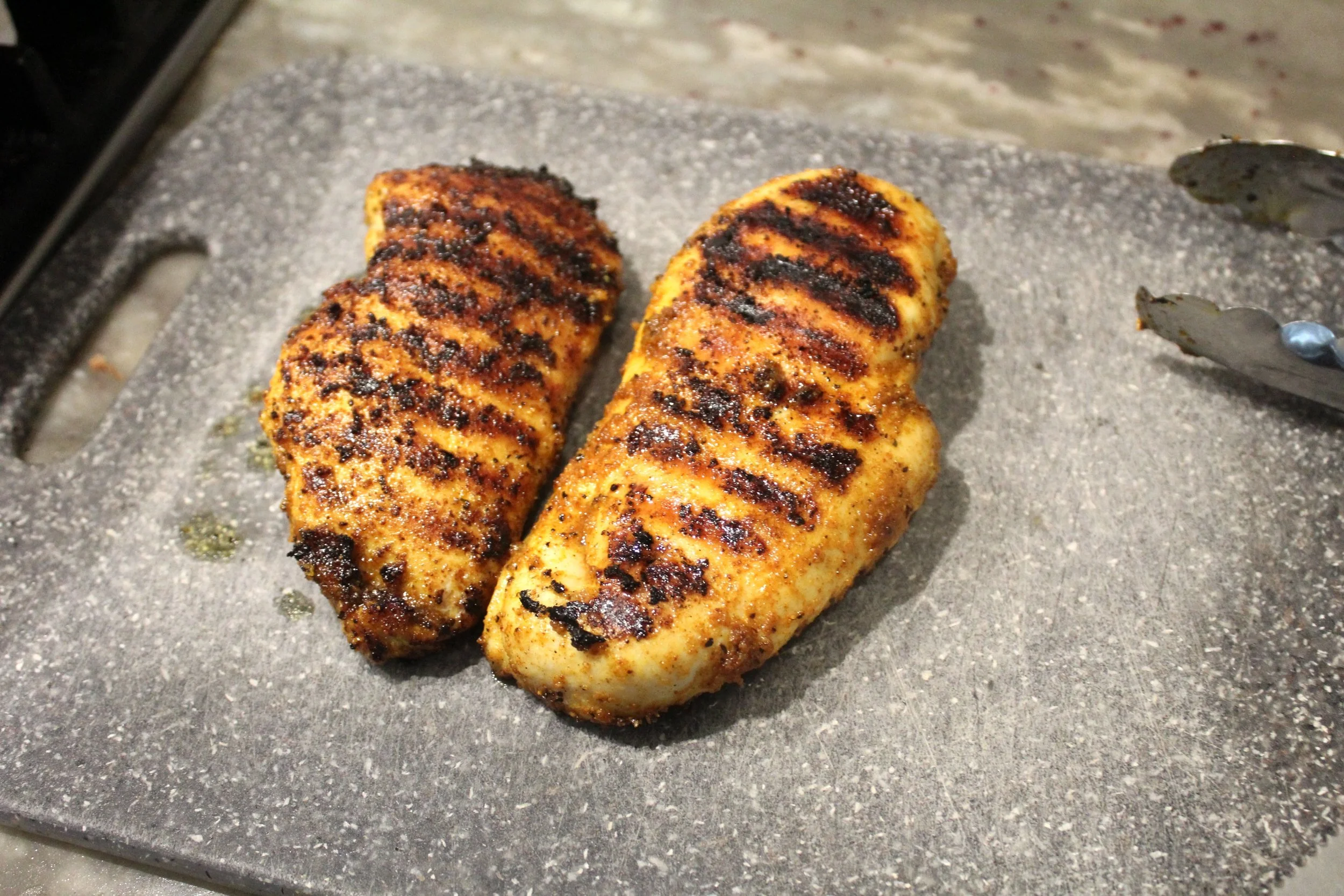 Add 1 tbsp of olive oil to a cast iron griddle pan. Once the pan is hot, add the chicken breasts. Cook 5-7 minutes on each side or until the internal temperature reaches 165 degrees. Once fully cooked, remove from the skillet and set on a cutting board.