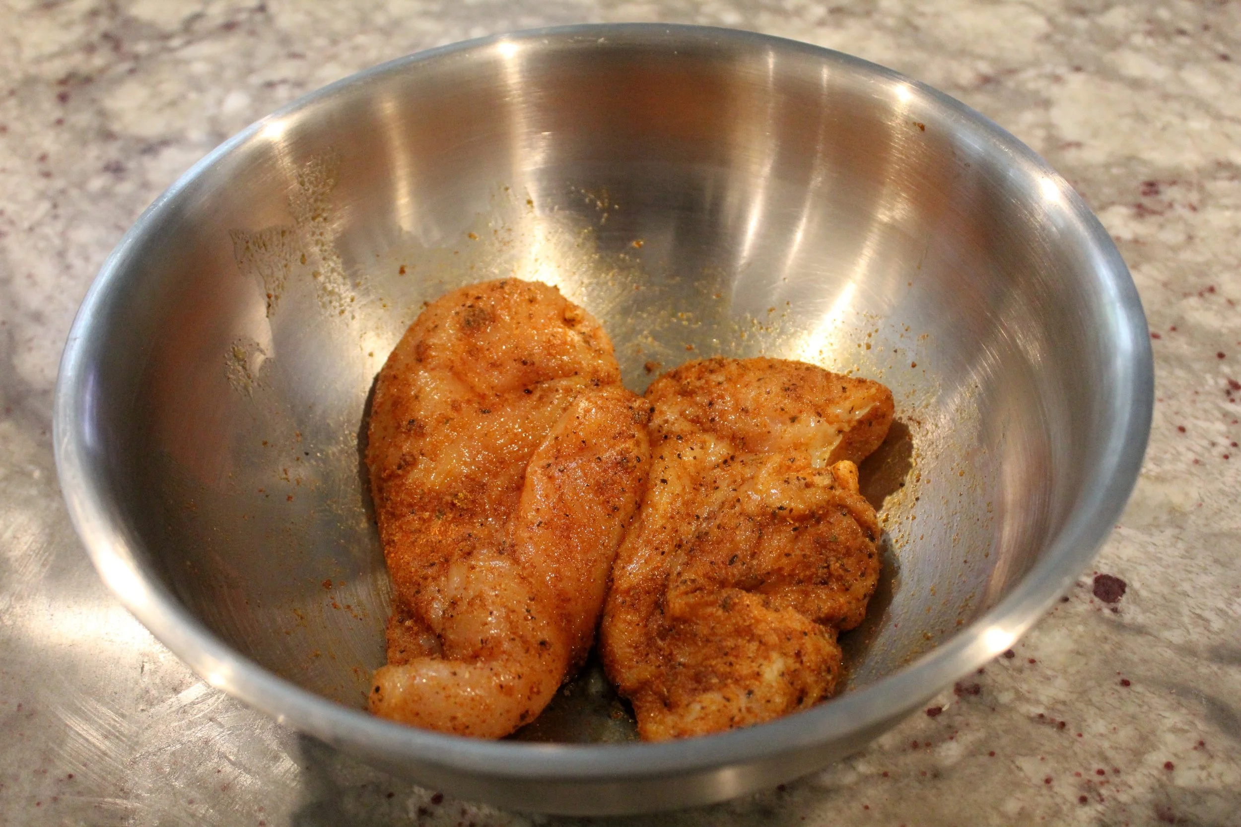 - Season chicken breasts with 1 tbsp of olive oil, garlic salt, paprika, onion powder and lemon pepper seasoning and make sure it is fully coated.