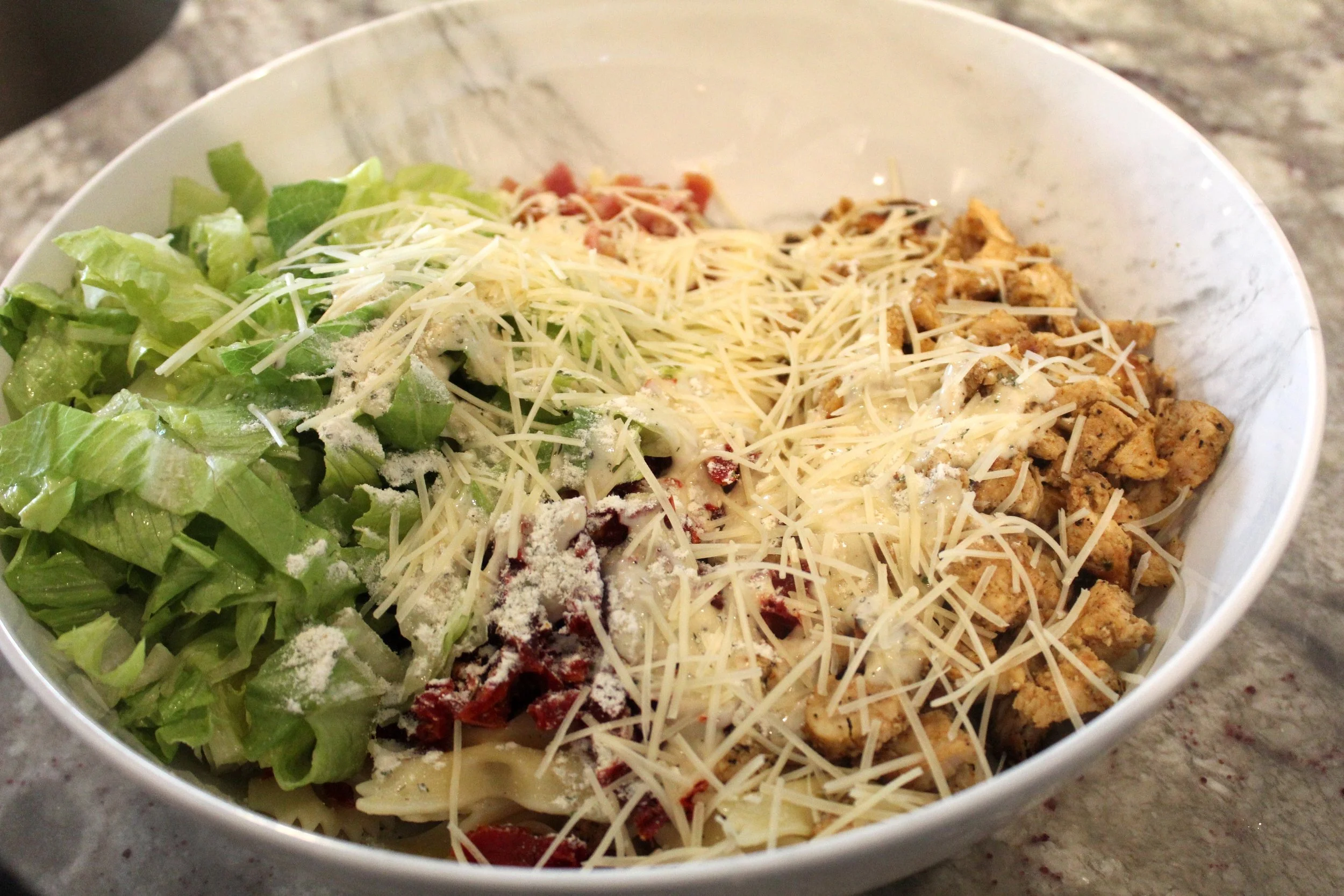 - In a bowl, add cooked bowtie pasta, washed and chopped Romaine lettuce, bacon pieces, sundried tomatoes, Caesar dressing, Ranch seasoning and shredded parmesan cheese and toss well. Feel free to add more dressing if needed.