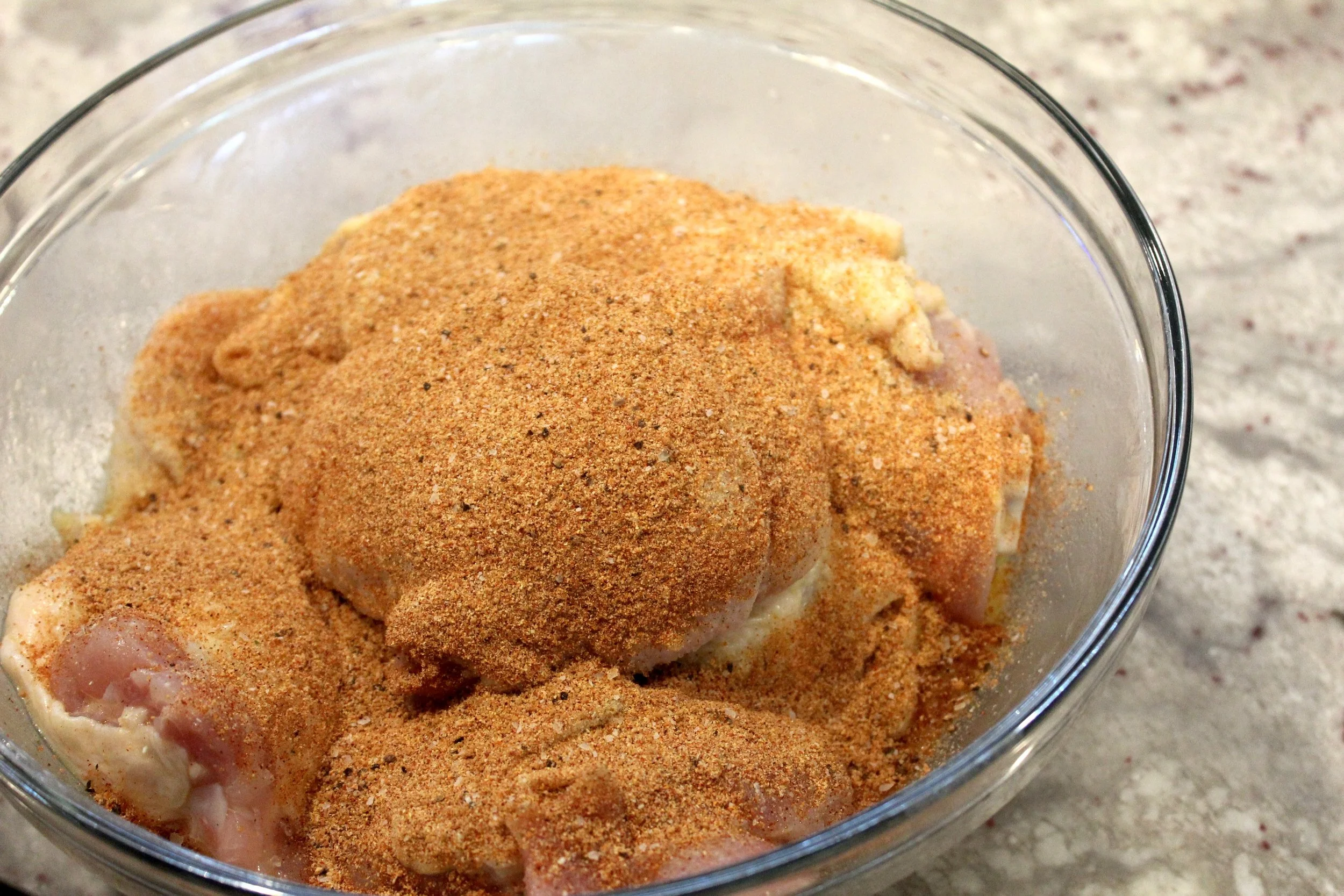 - Season the chicken with the hickory dry rub, garlic salt, paprika and onion powder and make sure each piece of chicken is fully coated in the seasoning.