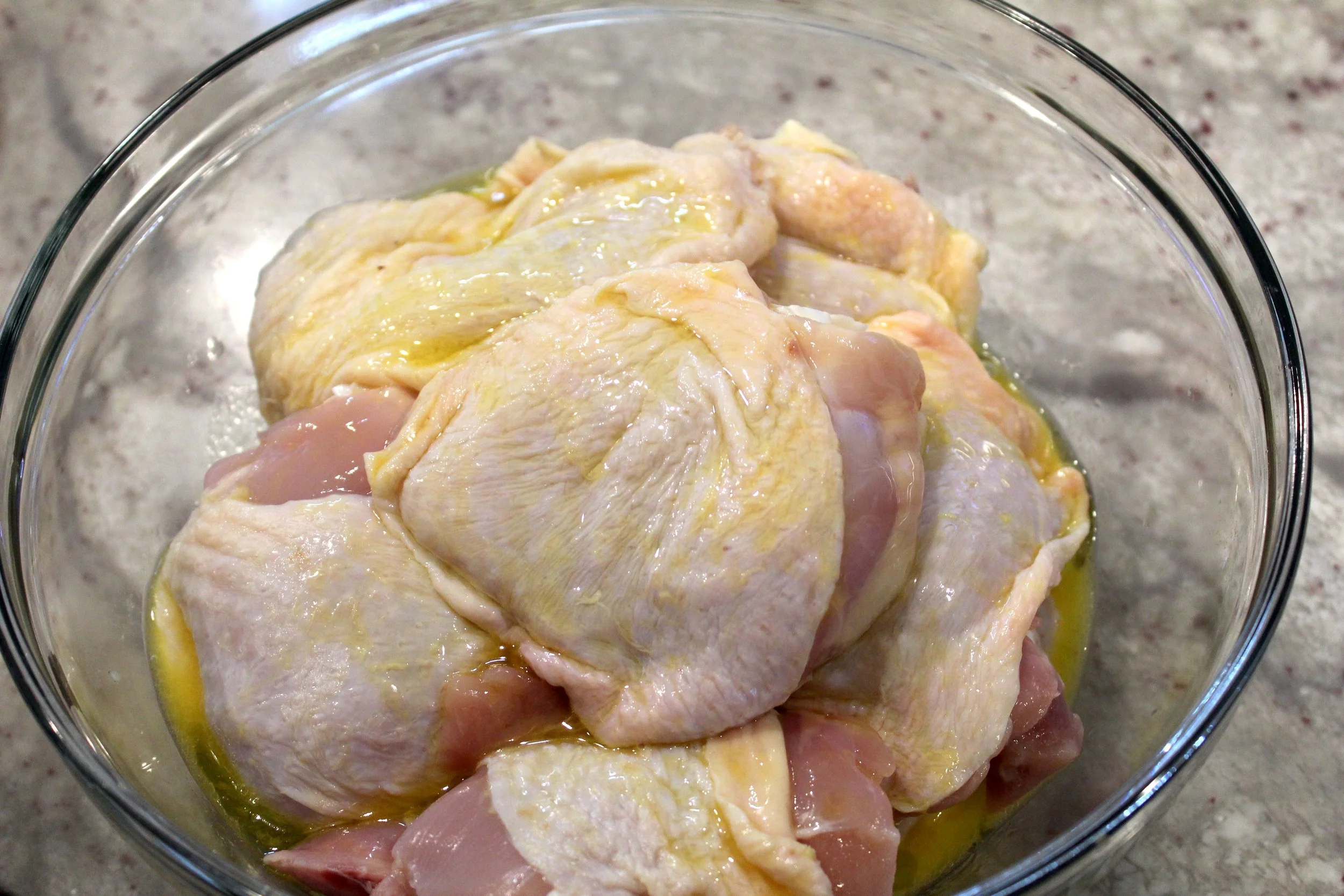 - Add melted butter and olive oil to the chicken thighs and make sure they are fully coated.