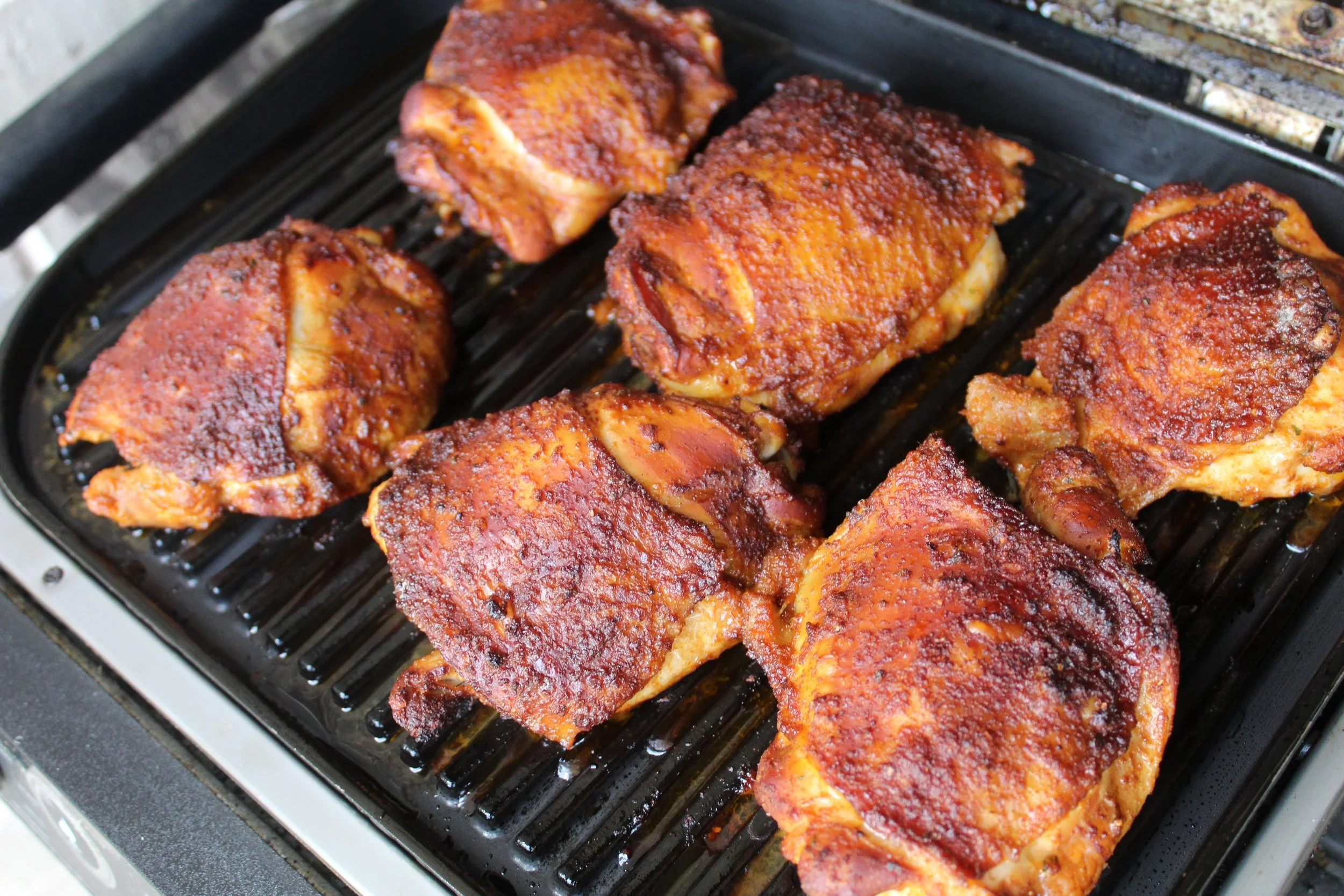 Juicy and delicious chicken thighs seasoned with a hickory dry rub and smoked to perfection.